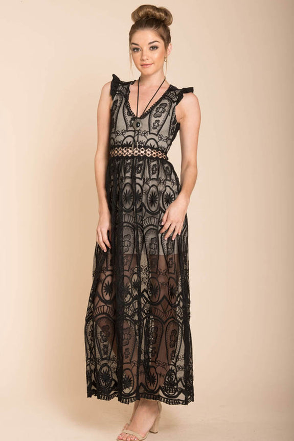 Bohemian Glamour. Capture the essence of the roaring 20s with this lacy, maxi dress with high slits and gorgeous open back.