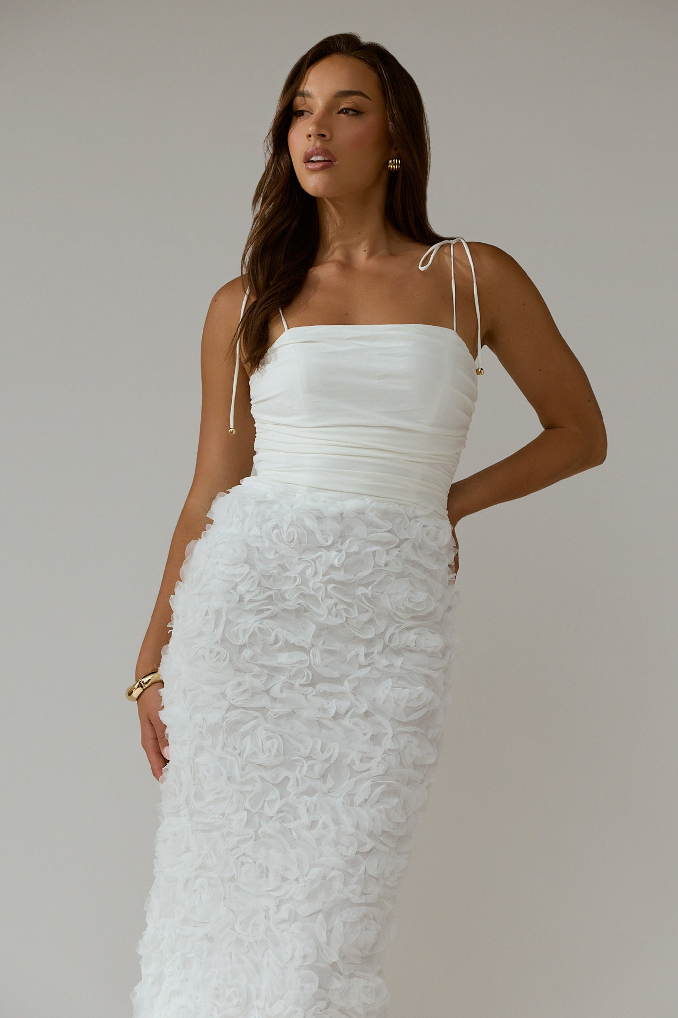 You'll look like you stepped out of Heaven in our stunning Love & Honor maxi dress. We are head over heels for the tied straps and pretty, floral embellishment detail in the skirt. It's the perfect choice for bridal events or a birthday celebration, teamed with white heels and a mini purse for an elegant look.