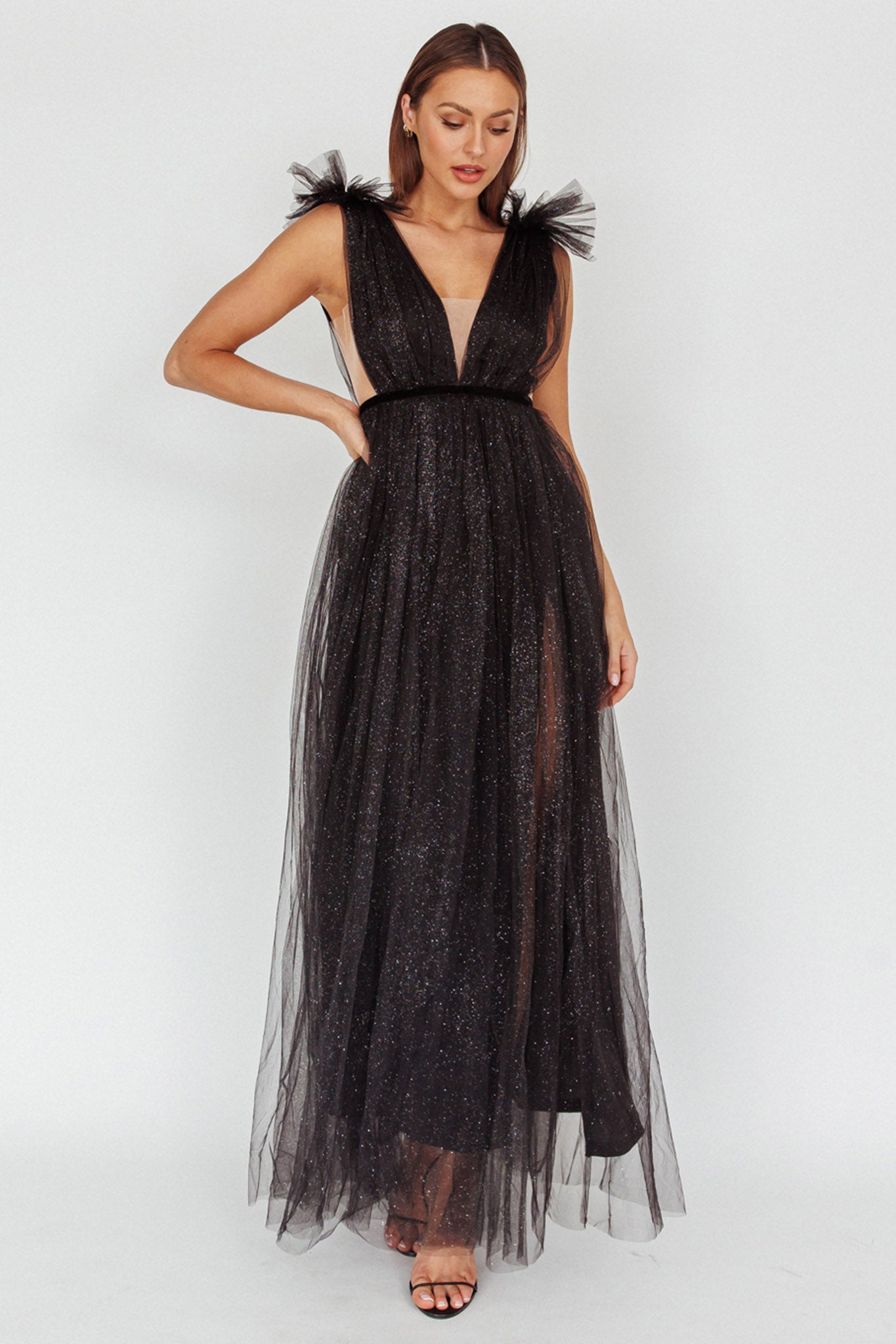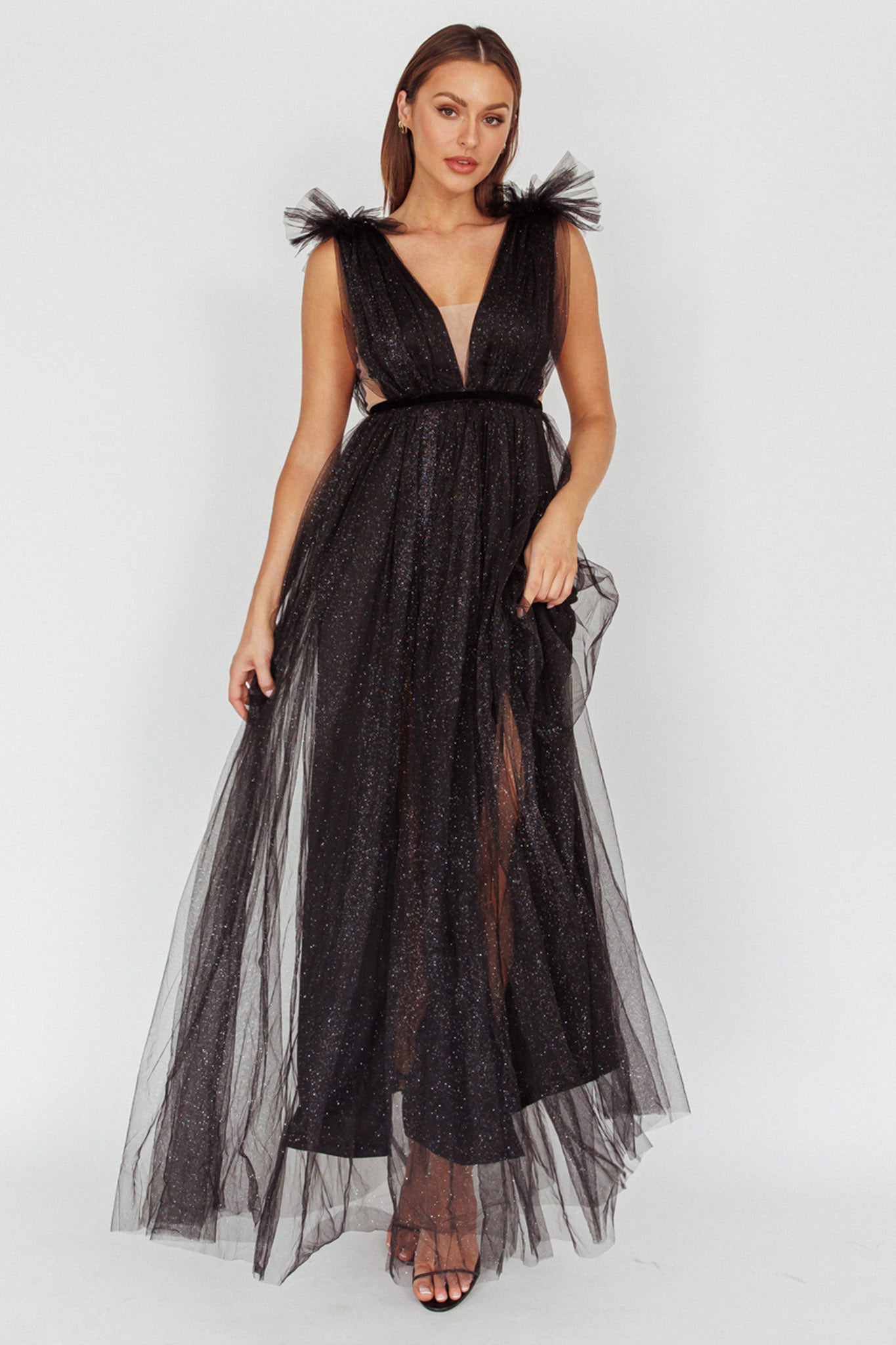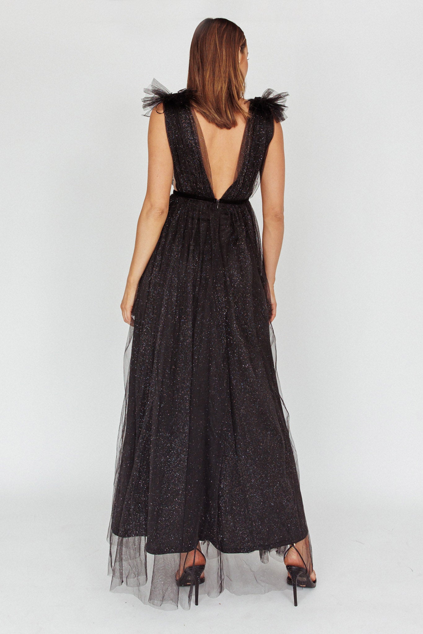 Ludivine Shoulder Accent Mesh Midi Dress Glitter Black