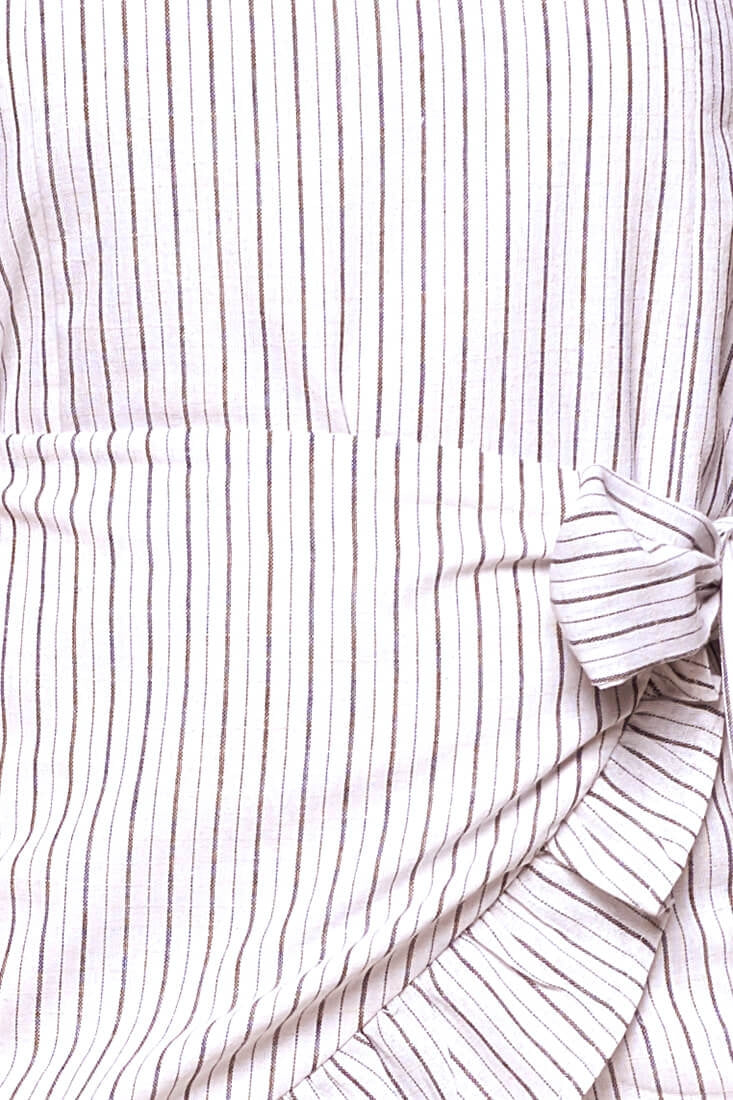 High-neck white striped cross over mini dress with open frilly sleeves.