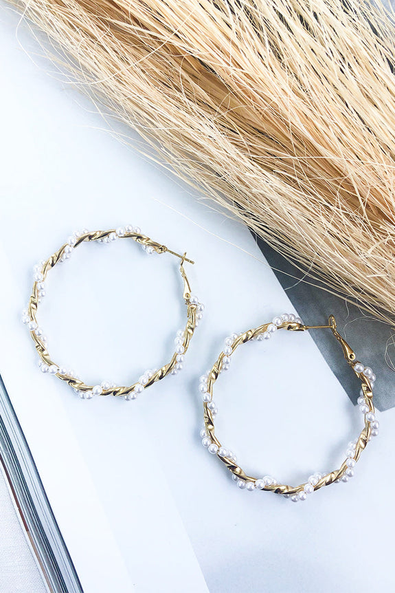 Make a statement in our super cute Luxe Life hoop earrings. We are loving the pearl beading that twists around the hoop -perfect for the girl who's just that little bit EXTRA. These would look amazing with an off shoulder mini dress and strappy heels. Yasss queen!