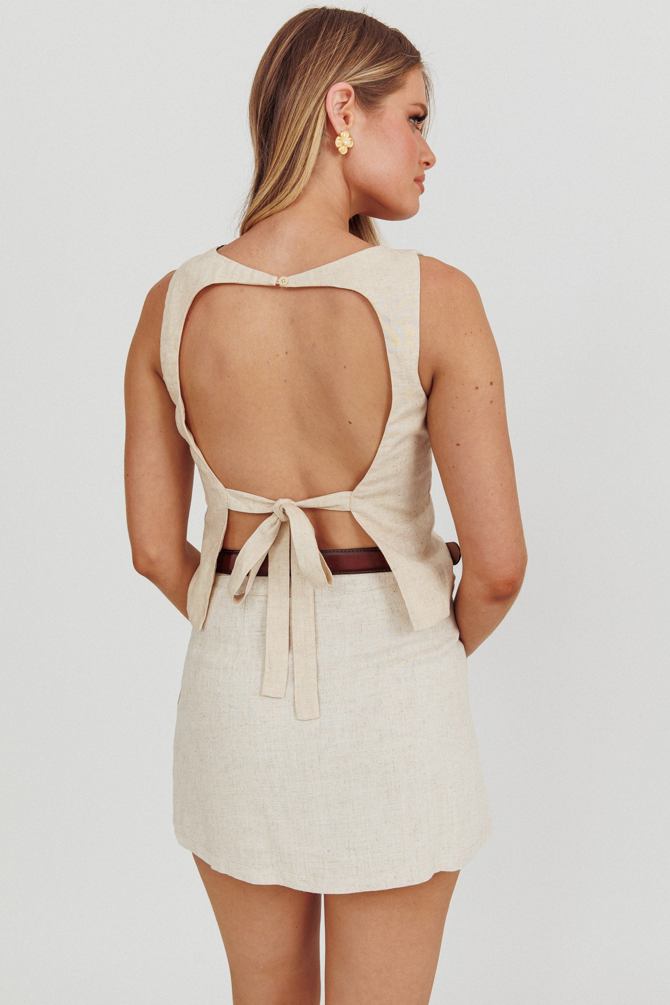 Light up the room in our gorgeous Lyre Song top. We are in love with the stylish opened back and the breathable linen fabric! It's perfect for a romantic date or birthday celebration! Adorn yourself with your favorite jewelry to take this top to the next level.