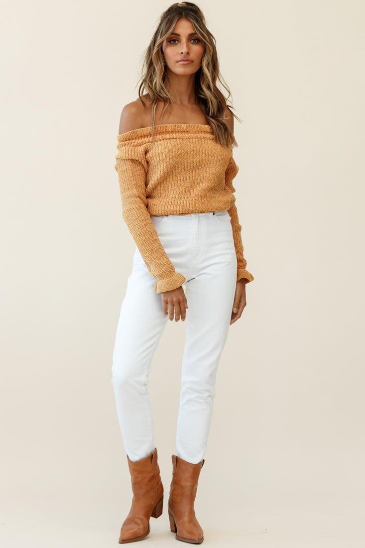 Snuggle up while looking ultra chic in our Mackenzie knit top. Featuring an off-shoulder style, long sleeves and frill hem. Perfect for a movie date teamed with jeans or a skirt and boots.