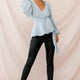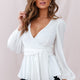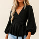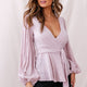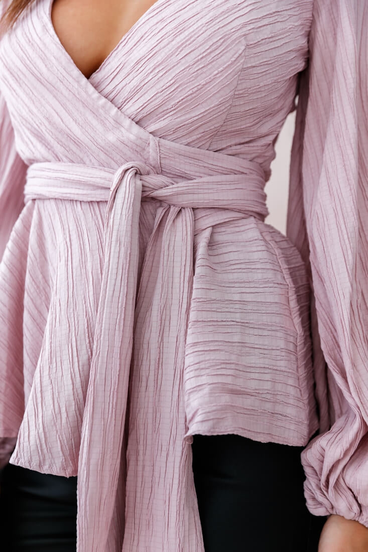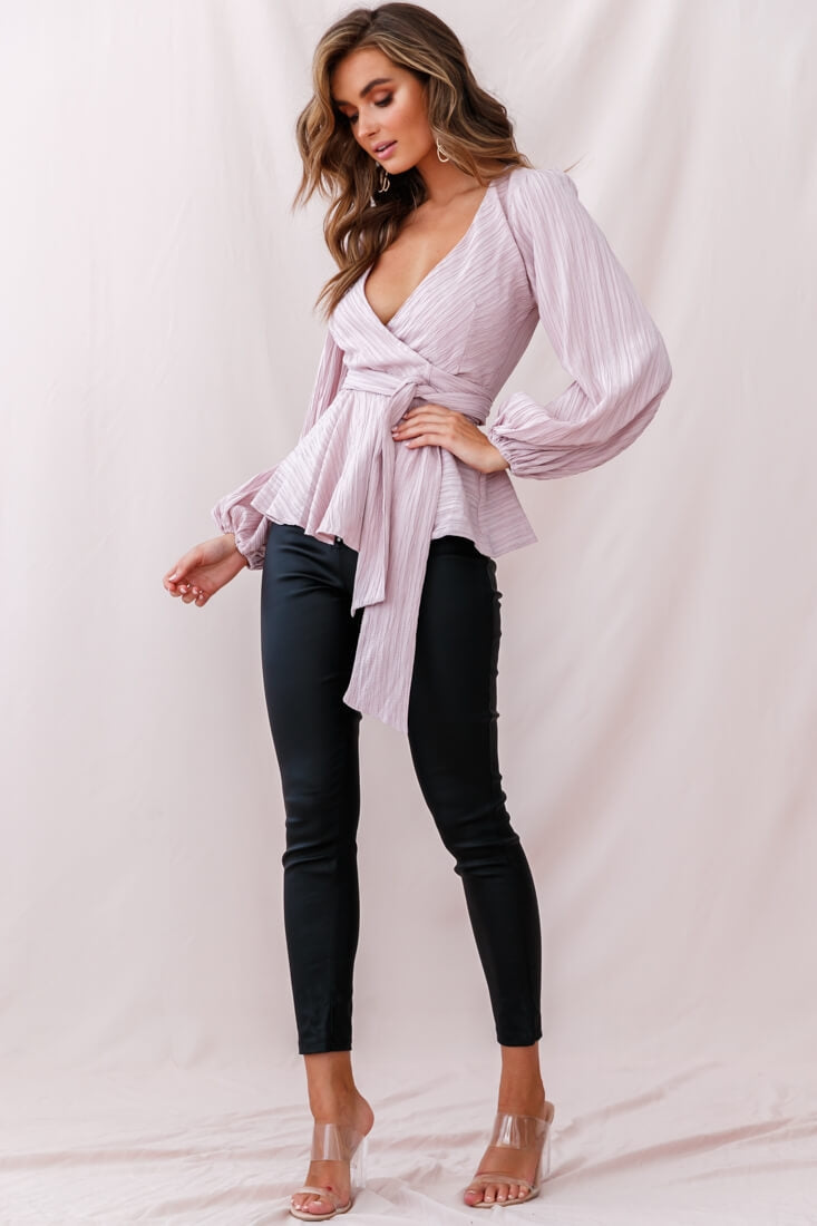 Stand out in this pretty wrap top. Featuring long lantern sleeves and a V-neckline that wraps under the bust and fastens with a ribbon tie at the side. We love it's flattering fluted torso for when you've had one too many desserts after dinner, oops! Team it with denim skinny jeans and gold hoop earrings for a look we are loving!