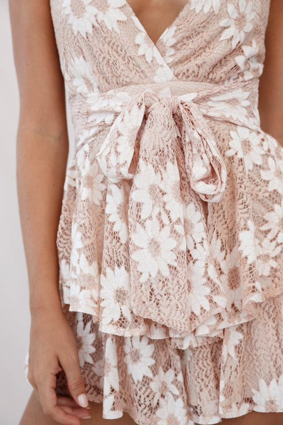 Get ready to turn heads as you strut your stuff in our super cute Maddox romper. Featuring stunning lace fabric, double layered skirt, adjustable straps and a waist panel with tie, this romper is feminine-chic and perfect for day or evening events. We are loving its low, strappy back, perfect for showing off your new (fake) tan (we won't tell). Team it with nude heels and hoop earrings and get ready for jaws to drop.