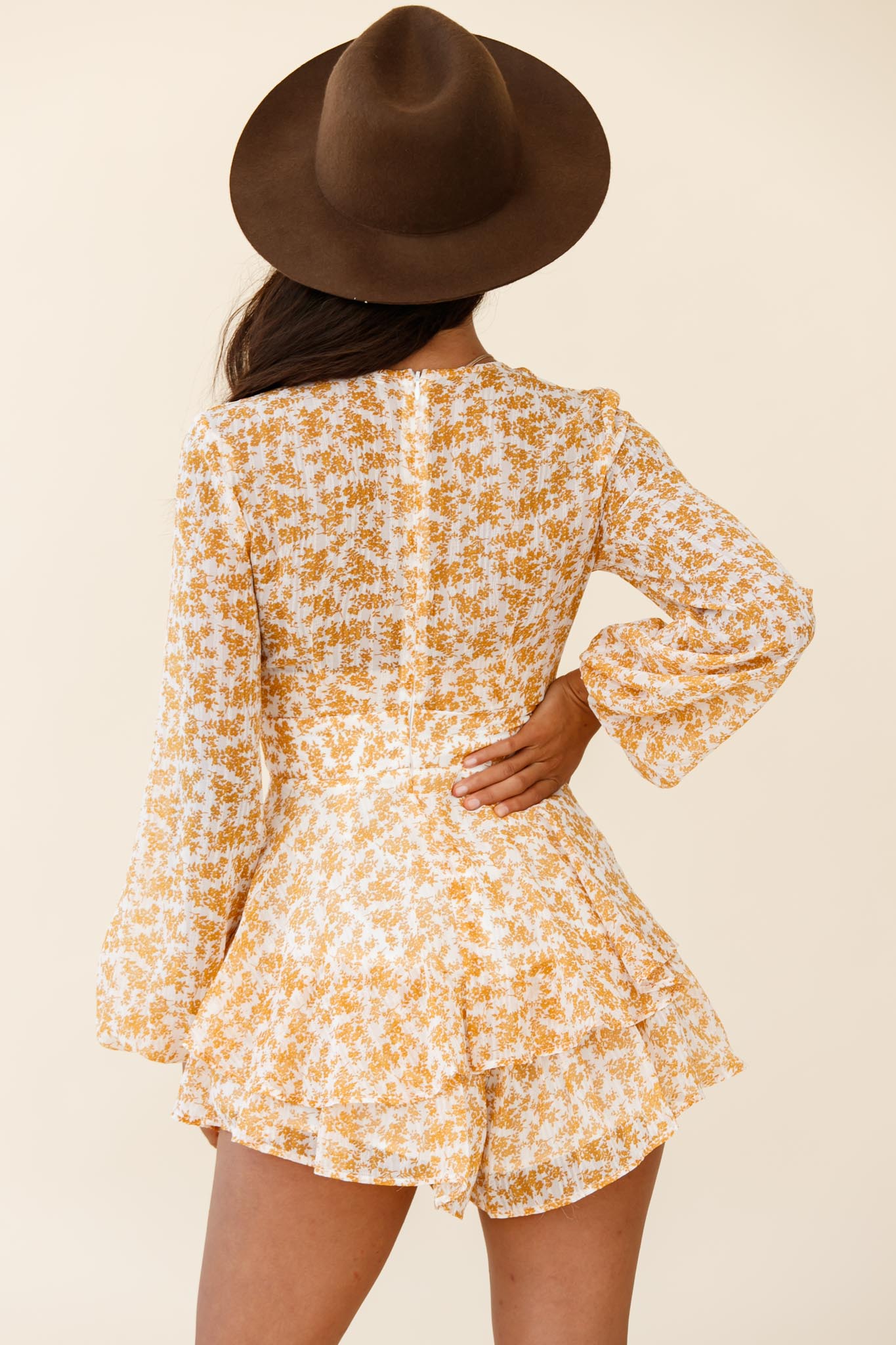 Maddox Fit & Flare Long Sleeve Romper Dainty Floral Print Mustard
