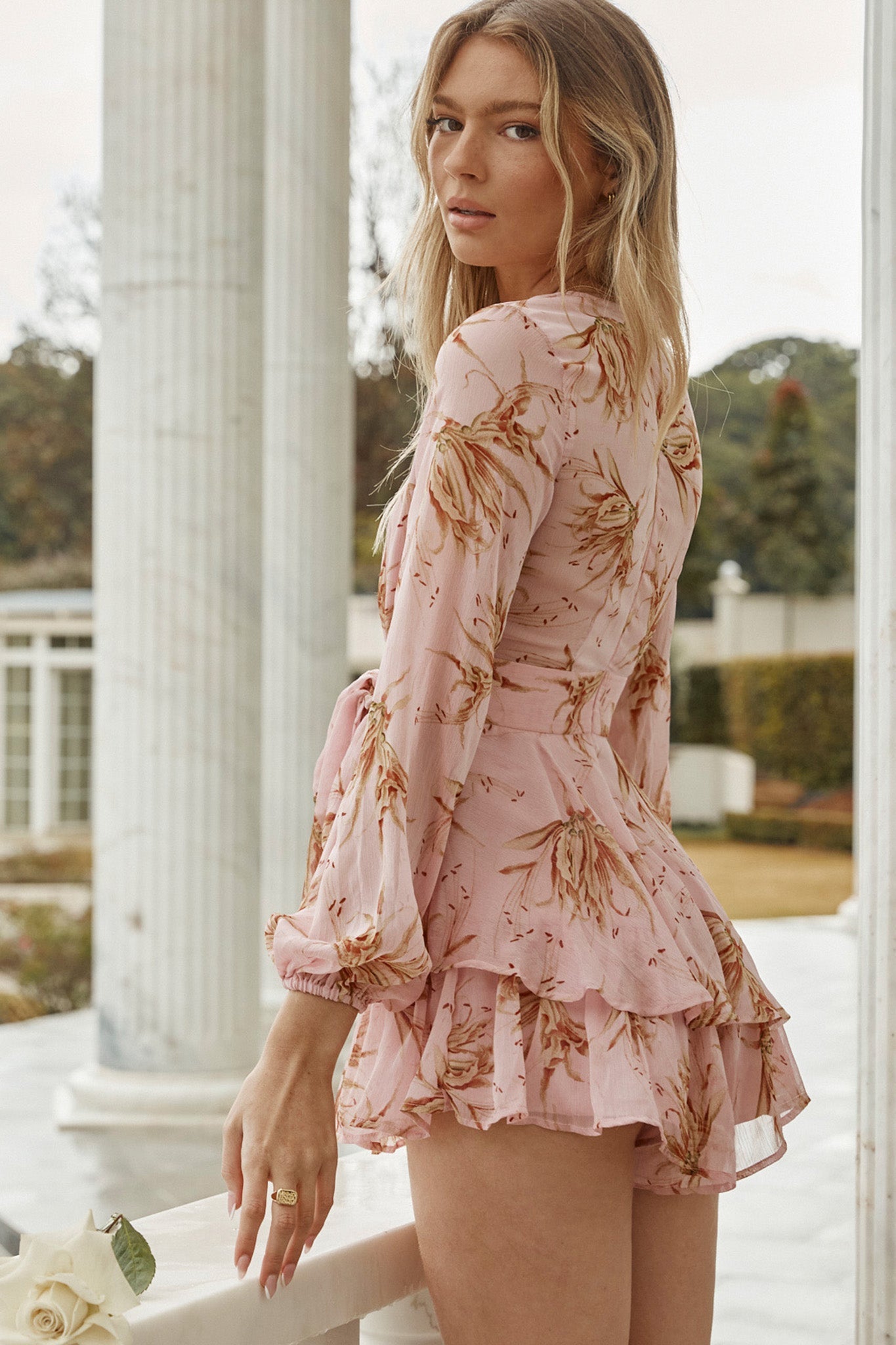 Maddox Fit & Flare Long Sleeve Romper Lily Print Pink