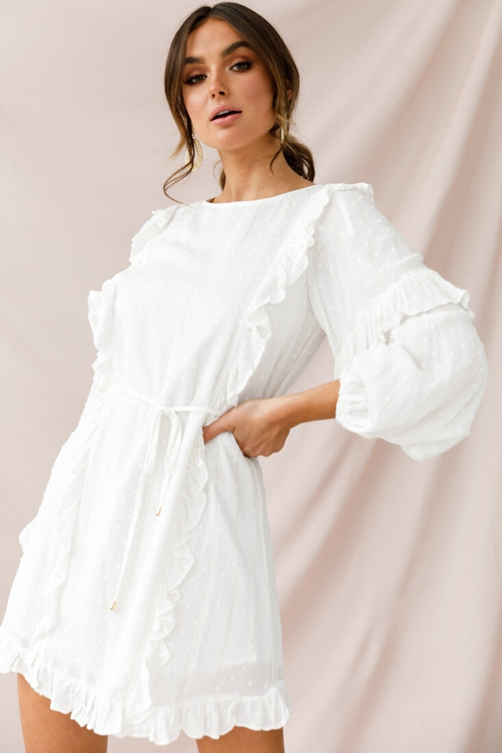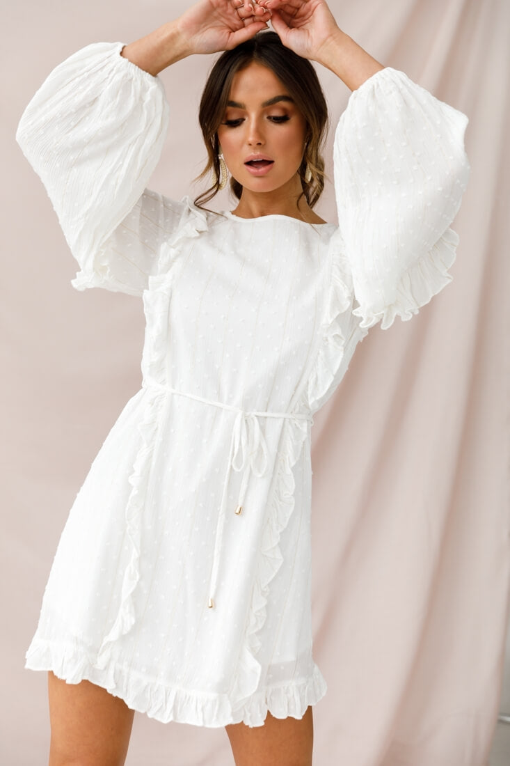 Hello there, fair maiden! You're the picture of innocence in our super sweet Maiden dress. Perfect for occasions that call for stylish modesty and elegance, like meeting the in-laws or Sunday morning church, this dress is just what you need. Featuring on-trend, long bishop sleeves with a frill around the upper arm, belt-loop string tie around the waist and girly, vertical frill down the front seams and hemline and fastening at the back collar with a button. The delicate hail-spot fabric is the icing on the cake.