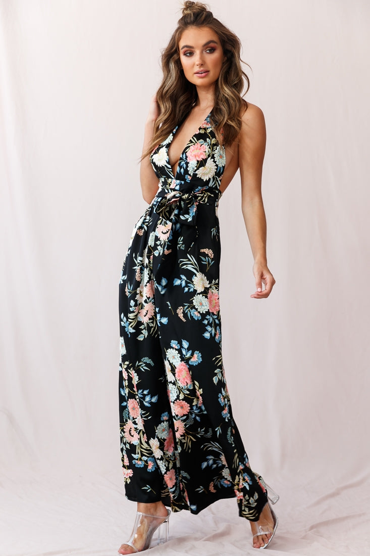 Make Me Halterneck Low Back Jumpsuit Floral Print Black