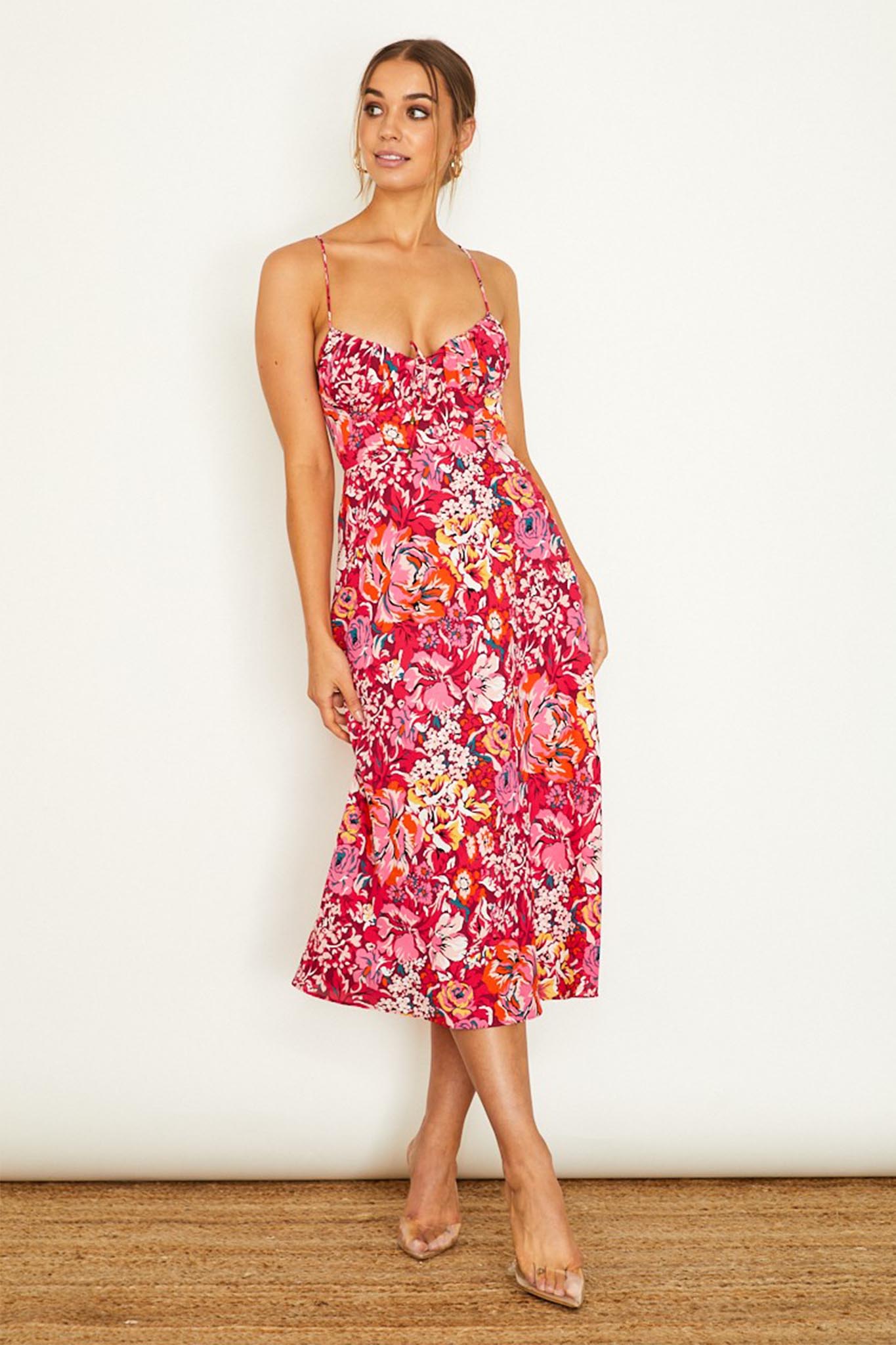 Malibu Gathered Bust Cami Strap Midi Dress Floral Red