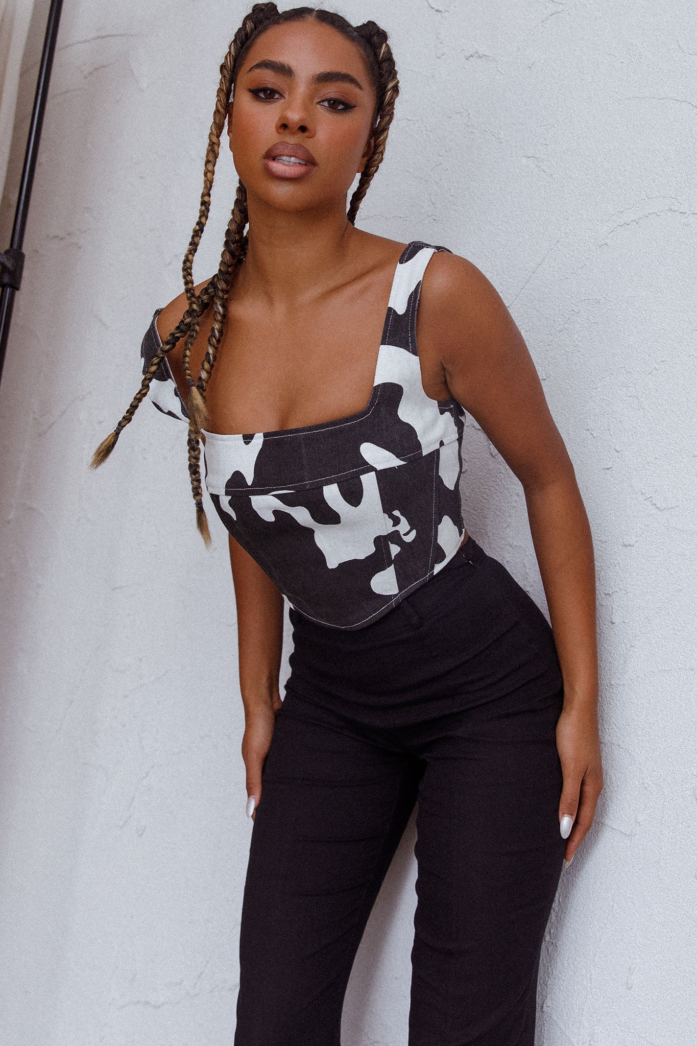 Hey there, cutie! You will be getting all the attention in our adorable Mandie crop top. We are obsessed with its flattering square neckline and 90's vibe cow print! Perfect for a flirty date or a girls' night out, teamed with flared jeans and platform heels. Hot!