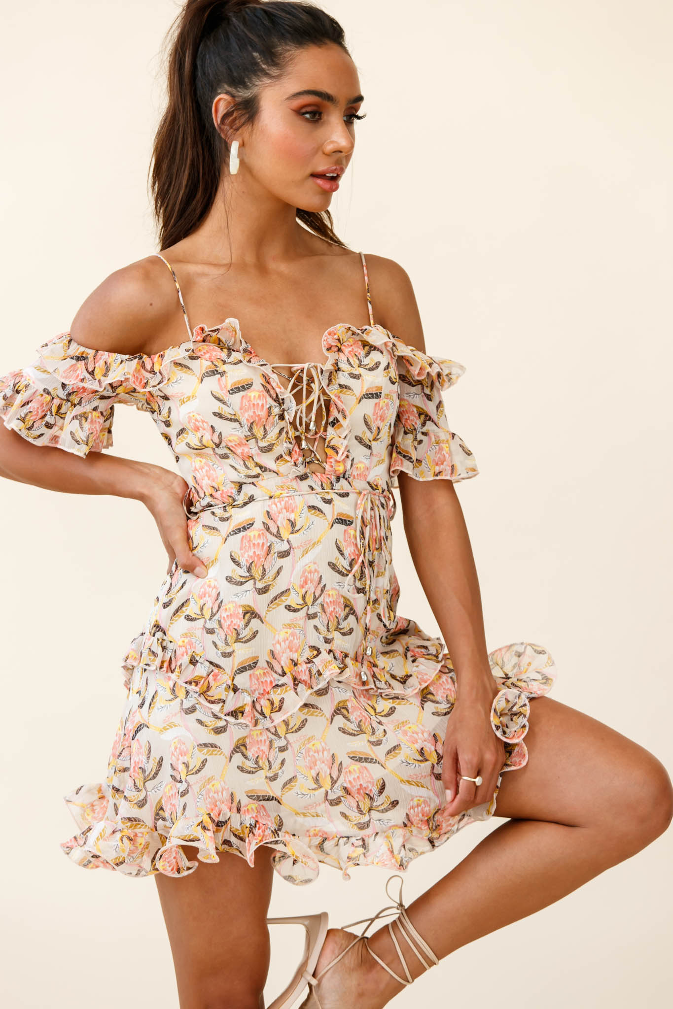 - Nude banksia floral print dress