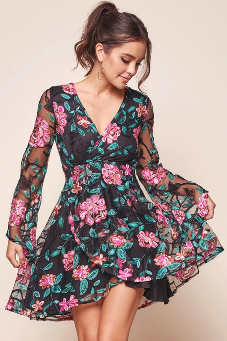 Tea time! Sheer embroidered floral print dress with a wrap-style bodice. This fit and flare dress pairs perfectly with black sandals.