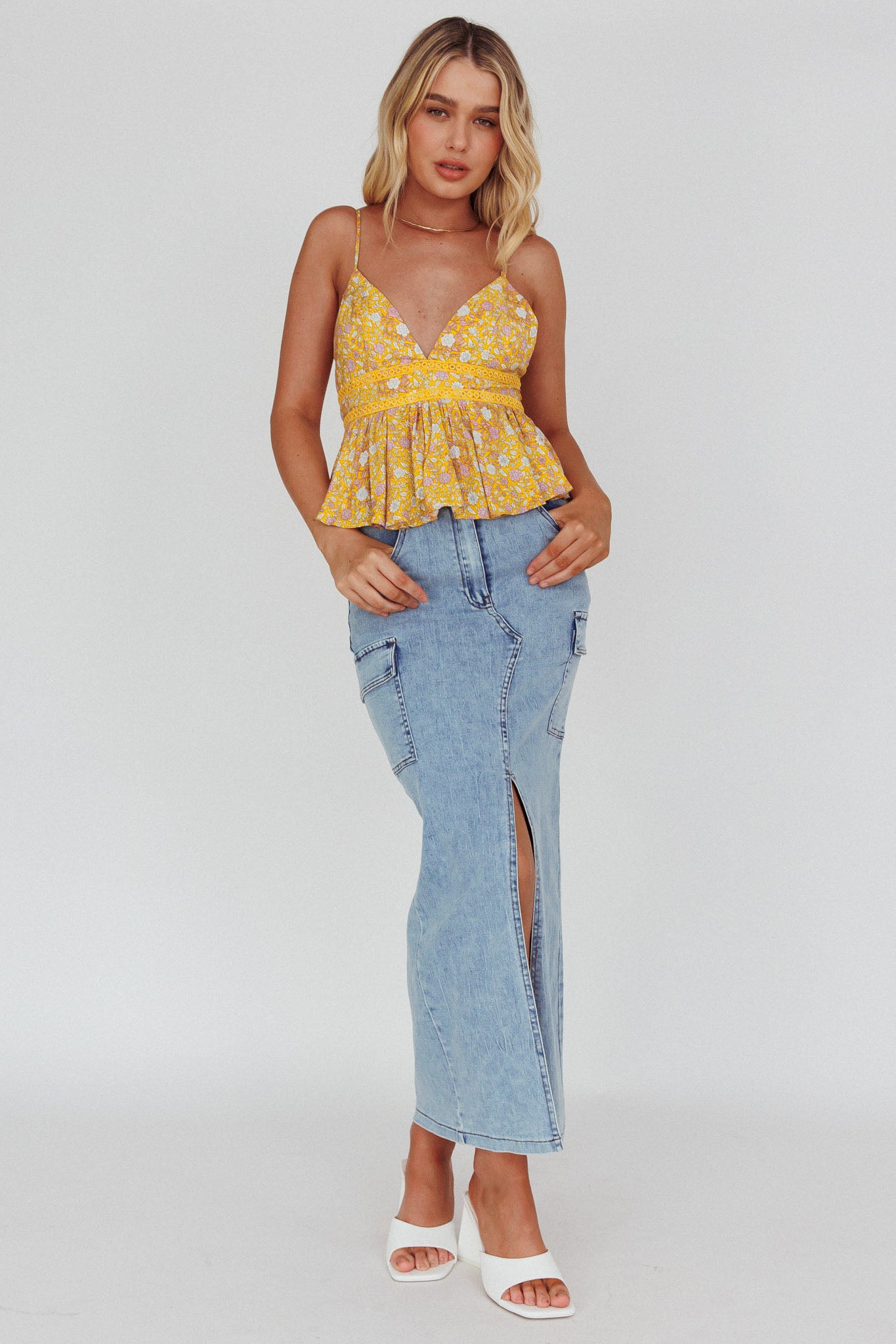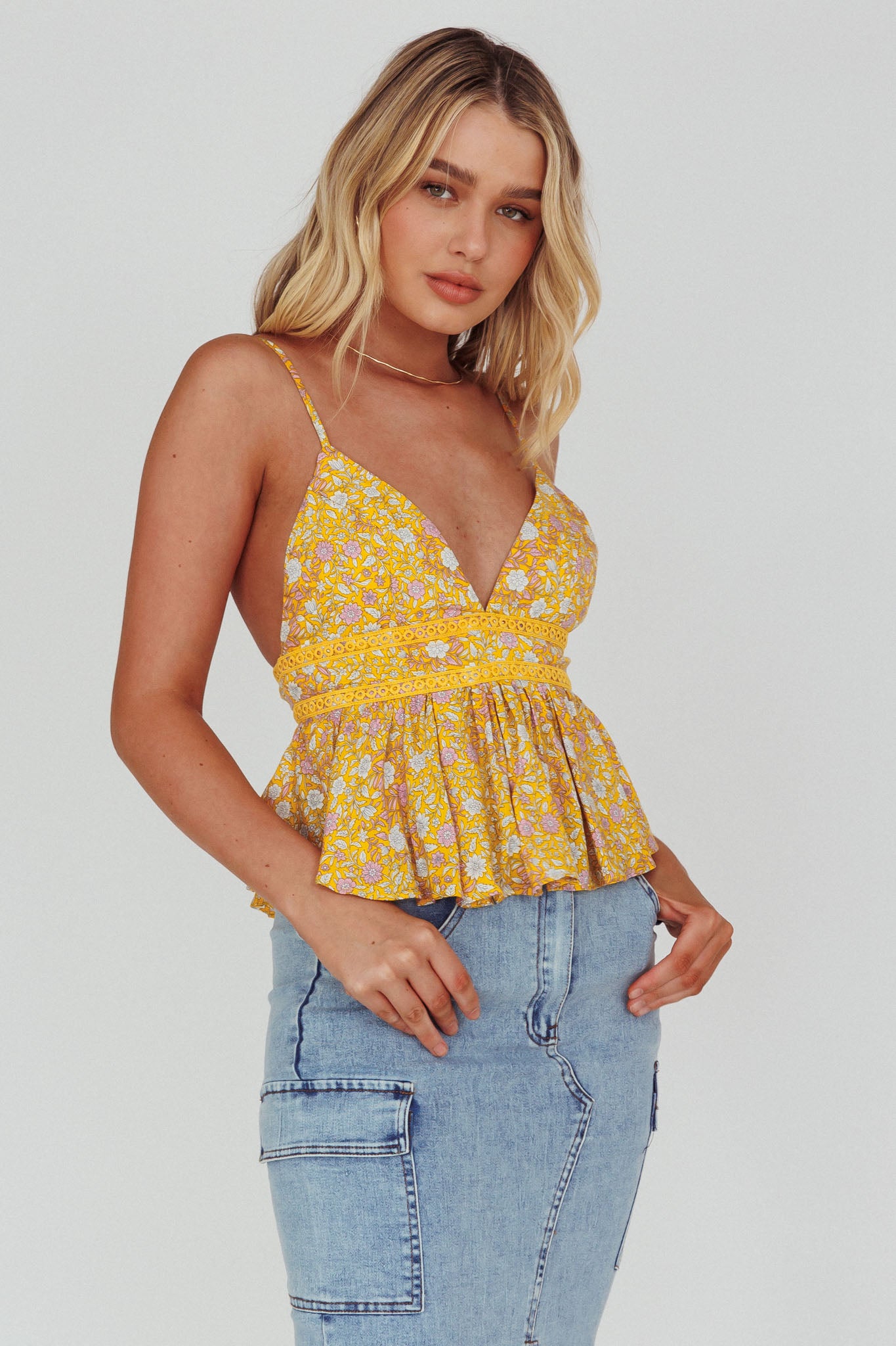 You'll feel like running through a field of wildflowers in our gorgeous Marigold top. We are obsessed with its super cute, frill waist and crochet trim details. Wear it to brunch with your besties teamed wide-leg jeans and wedges for a pretty look.