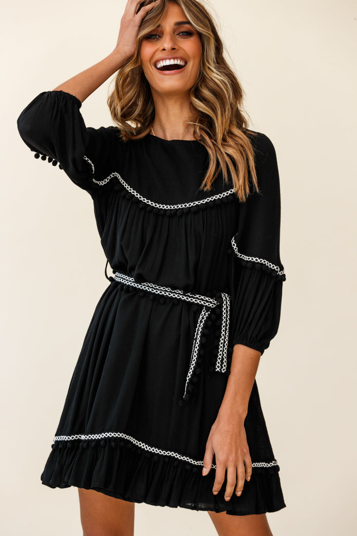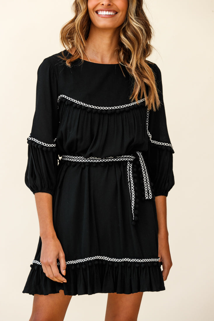 Breeze through your day in our boho-chic Marionette dress. It's super versatile and we are loving the pom-pom trim detail. Perfect for lunch dates with your girls paired with ankle boots and a felt hat or dress it up with tan mules and some gold hoops for a chic look we are loving.