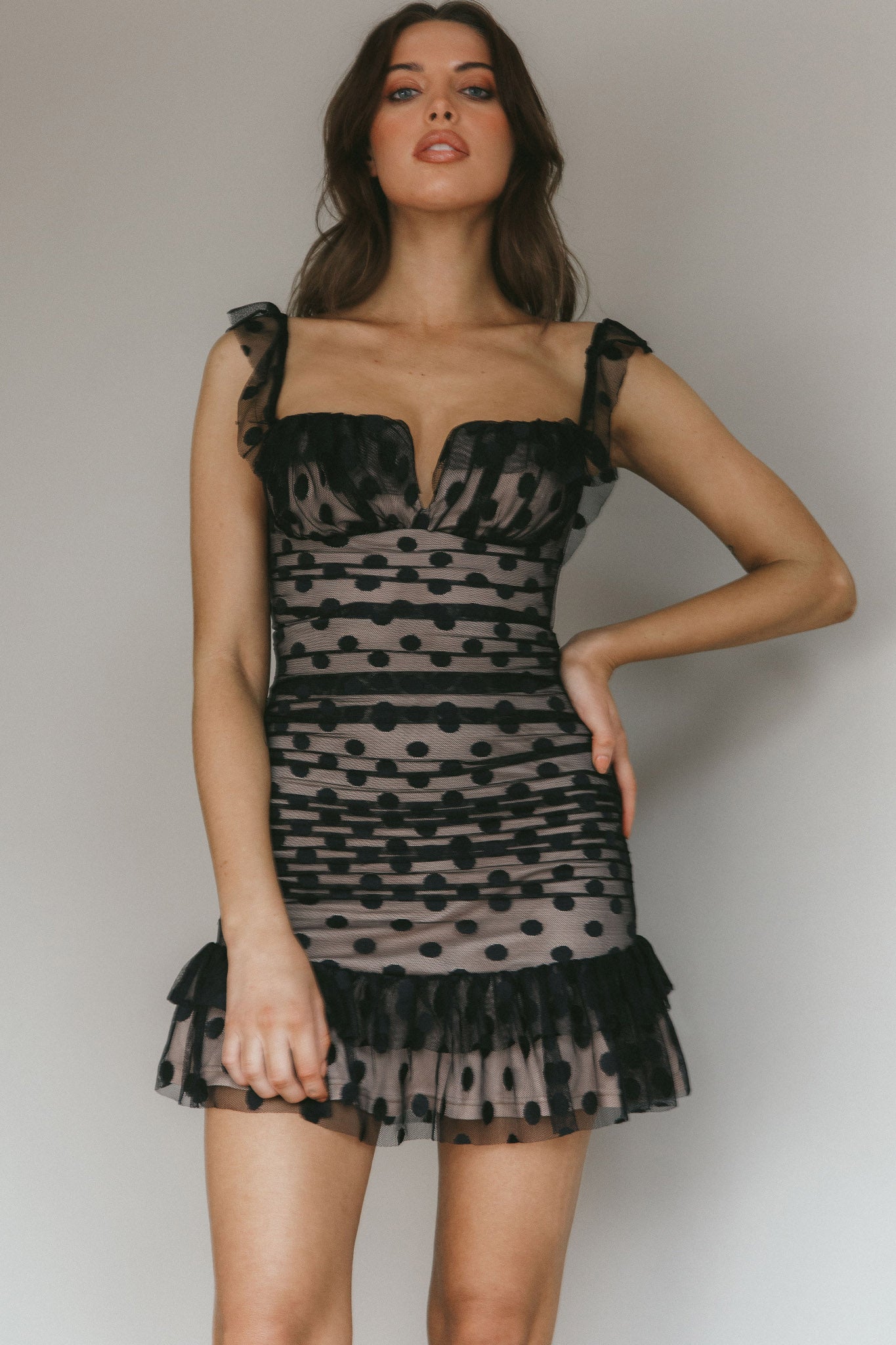 Chic and sweet, that's our Matilda. We are in love with the gorgeous, frill trim accents and pretty, polka dot mesh fabric. Perfect for a girls' night out or a birthday bash teamed with black, strappy stilettos and a chic clutch. Hot!
