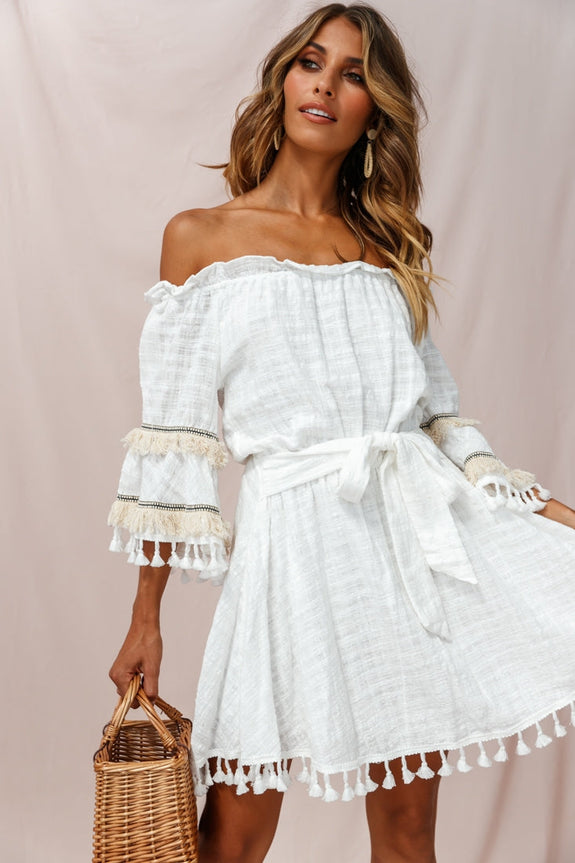 You'll feel like escaping to a tropical island paradise in our pretty linen Maya dress. Partially lined it features an off-shoulder neckline with fluted sleeves, elasticated waist and tassel and bead trim details. Perfect for warm nights sipping piña coladas at your favorite beach bar or Sunday brunch with your besties. Team it with espadrille wedges and a straw tote for a look we are loving!
