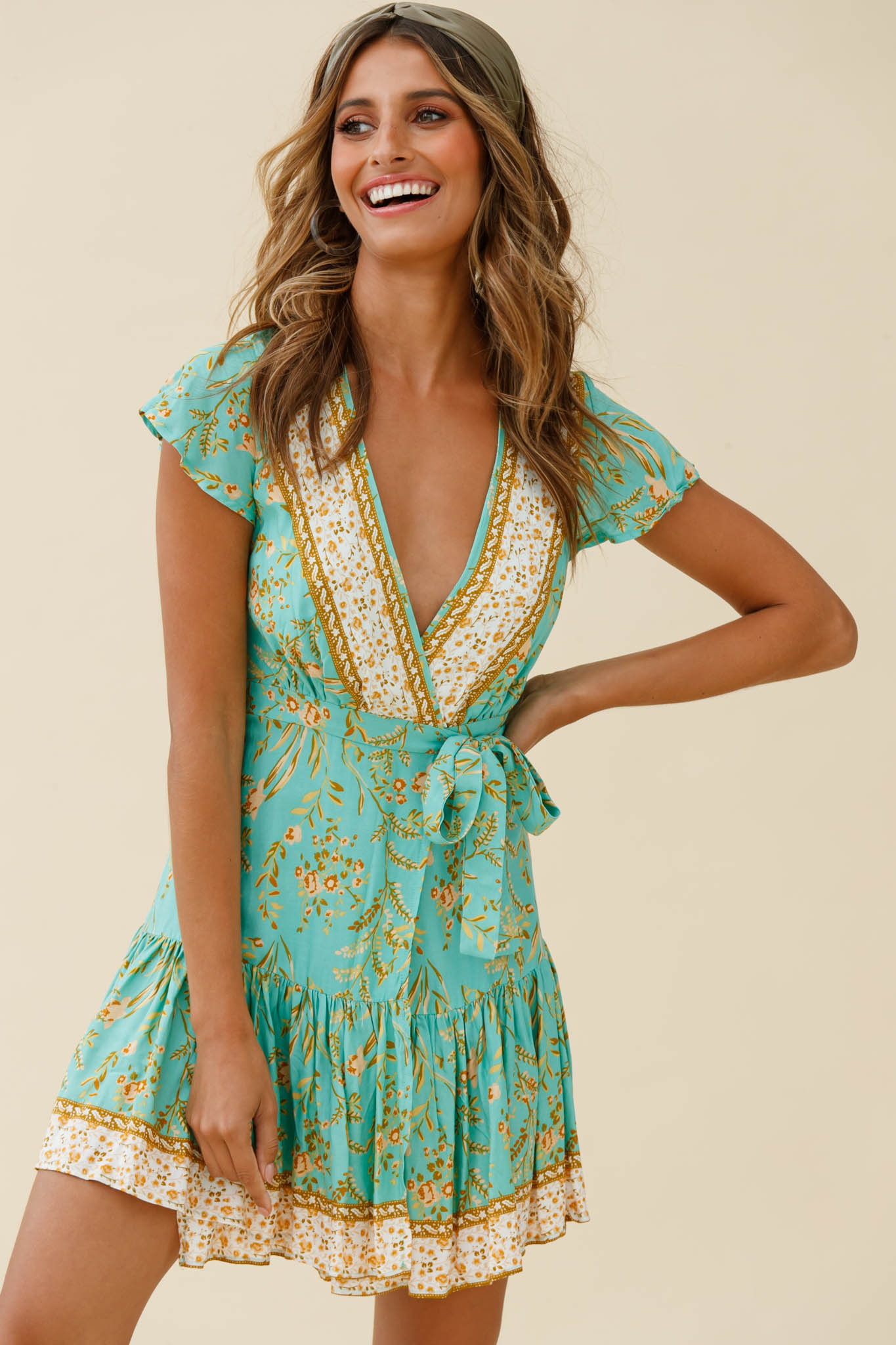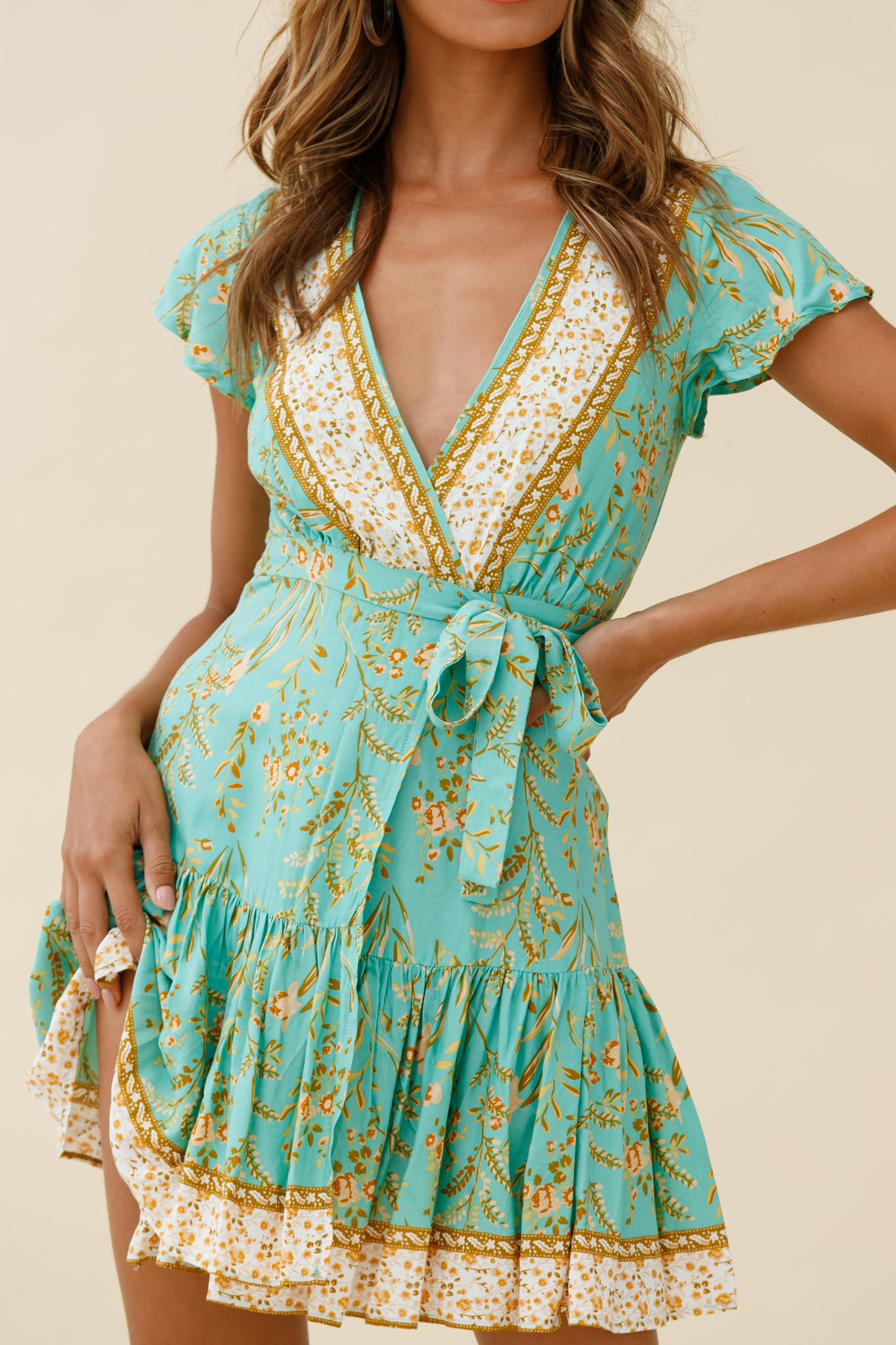 Make a statement in our pretty Mayan dress. Featuring fluttery angel sleeves, a wrap-style waist that ties at the side and a fluted hem. We are loving its boho-femme floral print! Perfect for a day strolling the vintage markets teamed with a straw hat and canvas wedges.