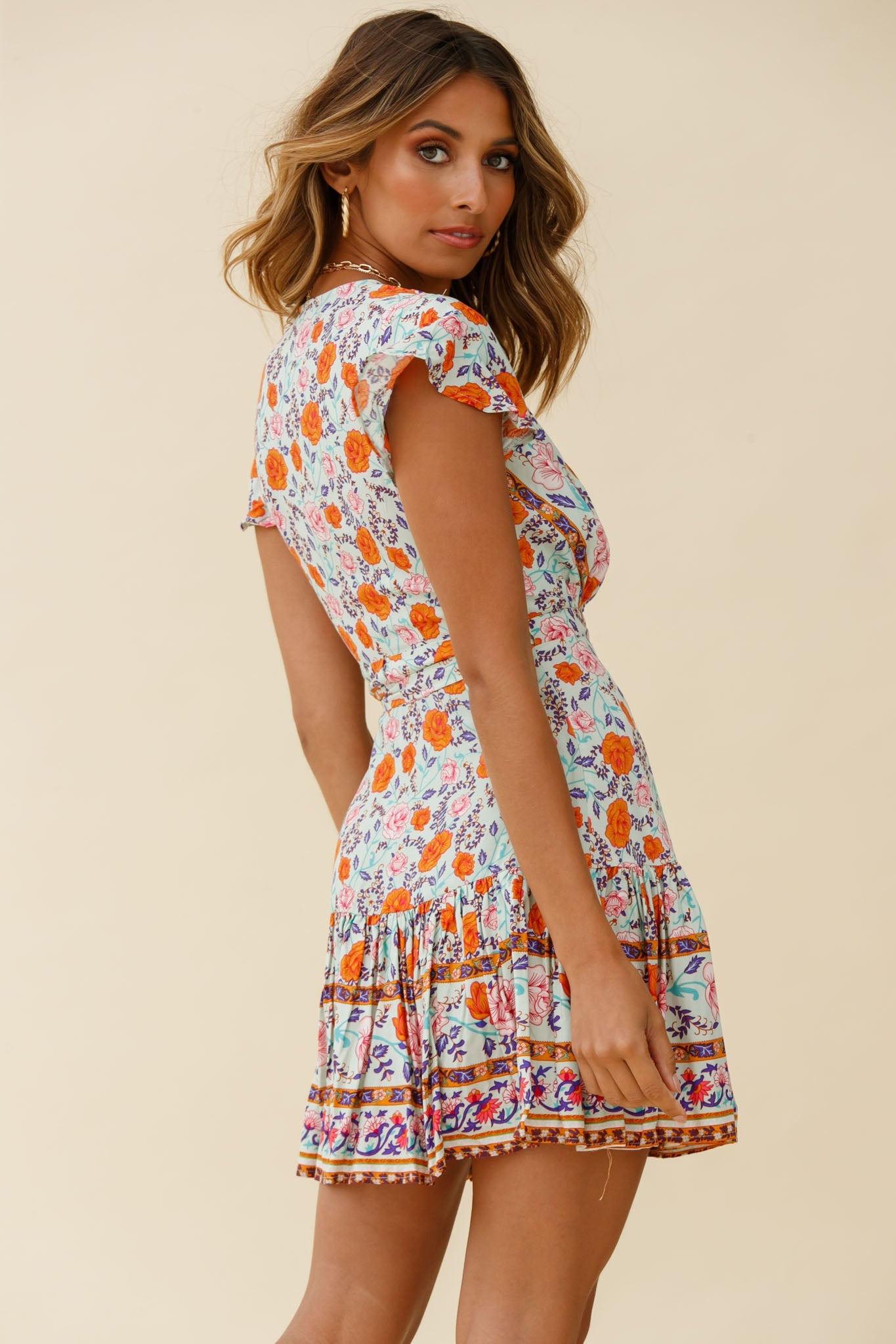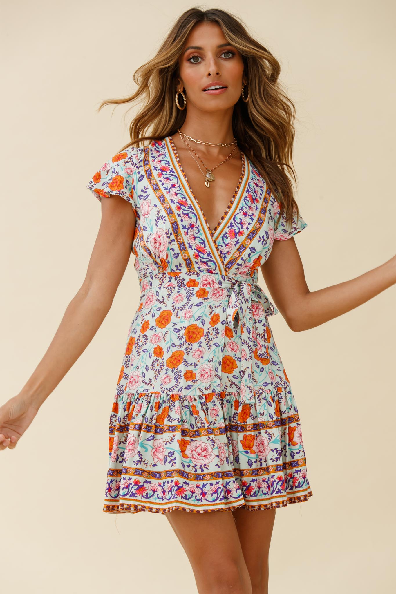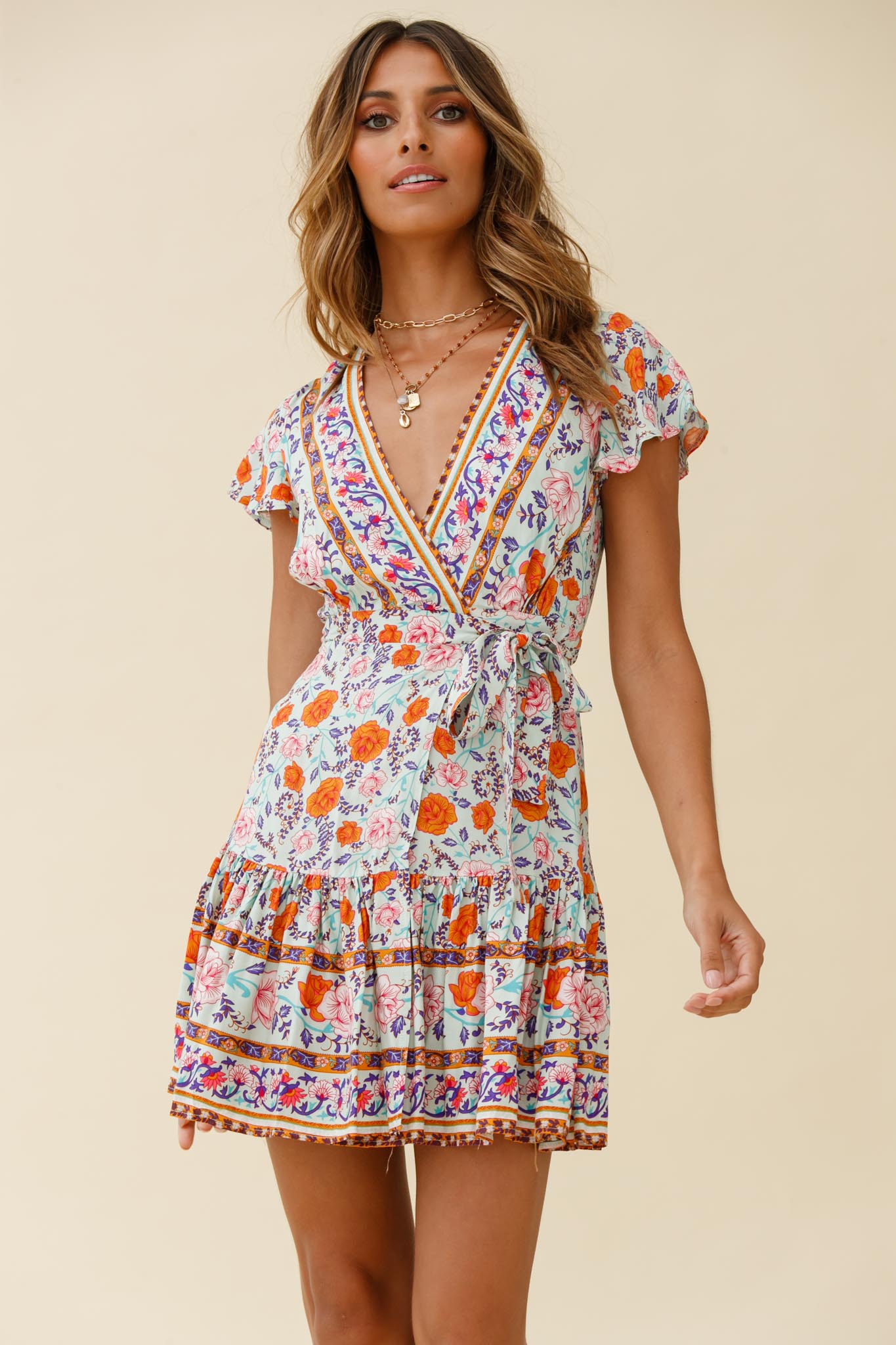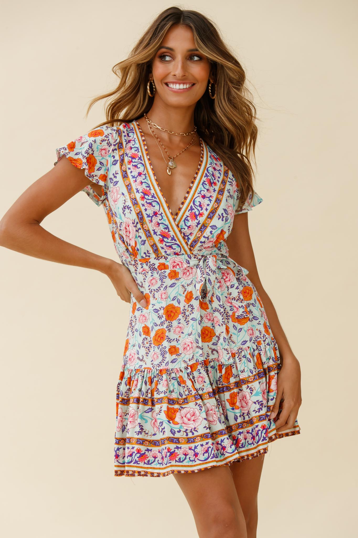 Make a statement in our pretty Mayan dress. Featuring fluttery angel sleeves, a wrap-style waist that ties at the side and a fluted hem. We are loving its boho-femme floral print! Perfect for a day strolling the vintage markets teamed with a straw hat and canvas wedges.