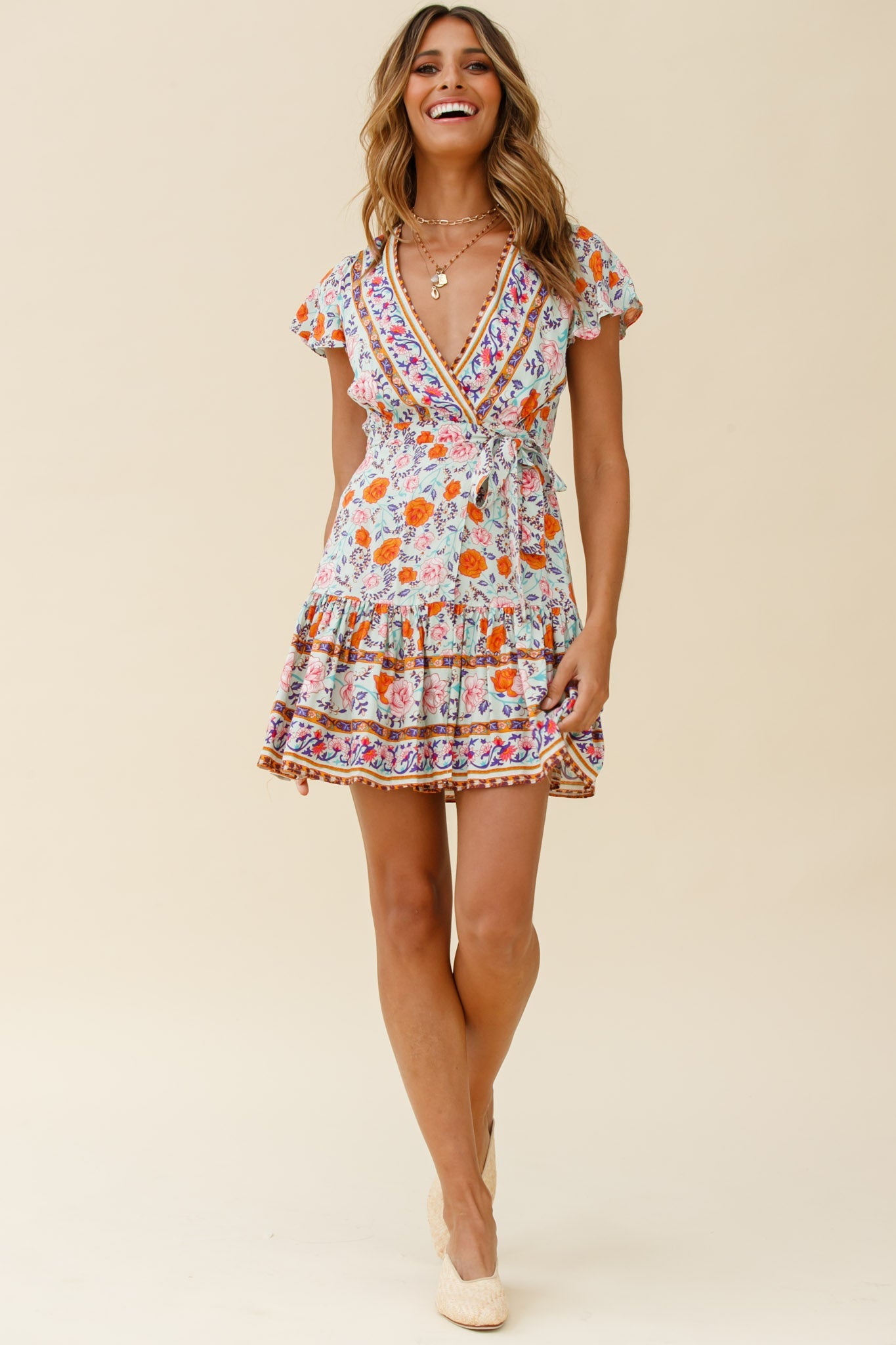 Mayan Angel Sleeve Waist Tie Wrap Dress Floral Print Mint/Pink