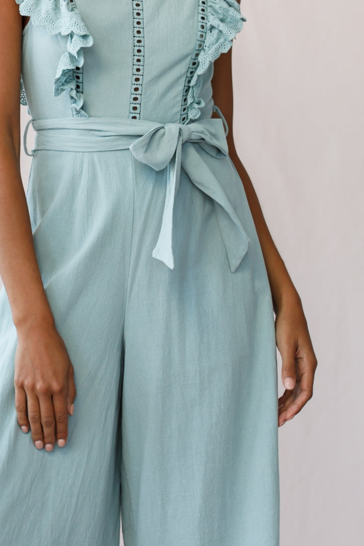 Every day will feel like a sweet sunny day in our Meadow midi jumpsuit. Perfect for strolling the farmers' markets or coffee dates with your bff, it features an adorable pinafore style front, ruffle straps, wide leg pant with scalloped lace hem, a beautiful open back and separate waist-tie belt. Wear it teamed with wedges and a straw bag for an ultra cute look.