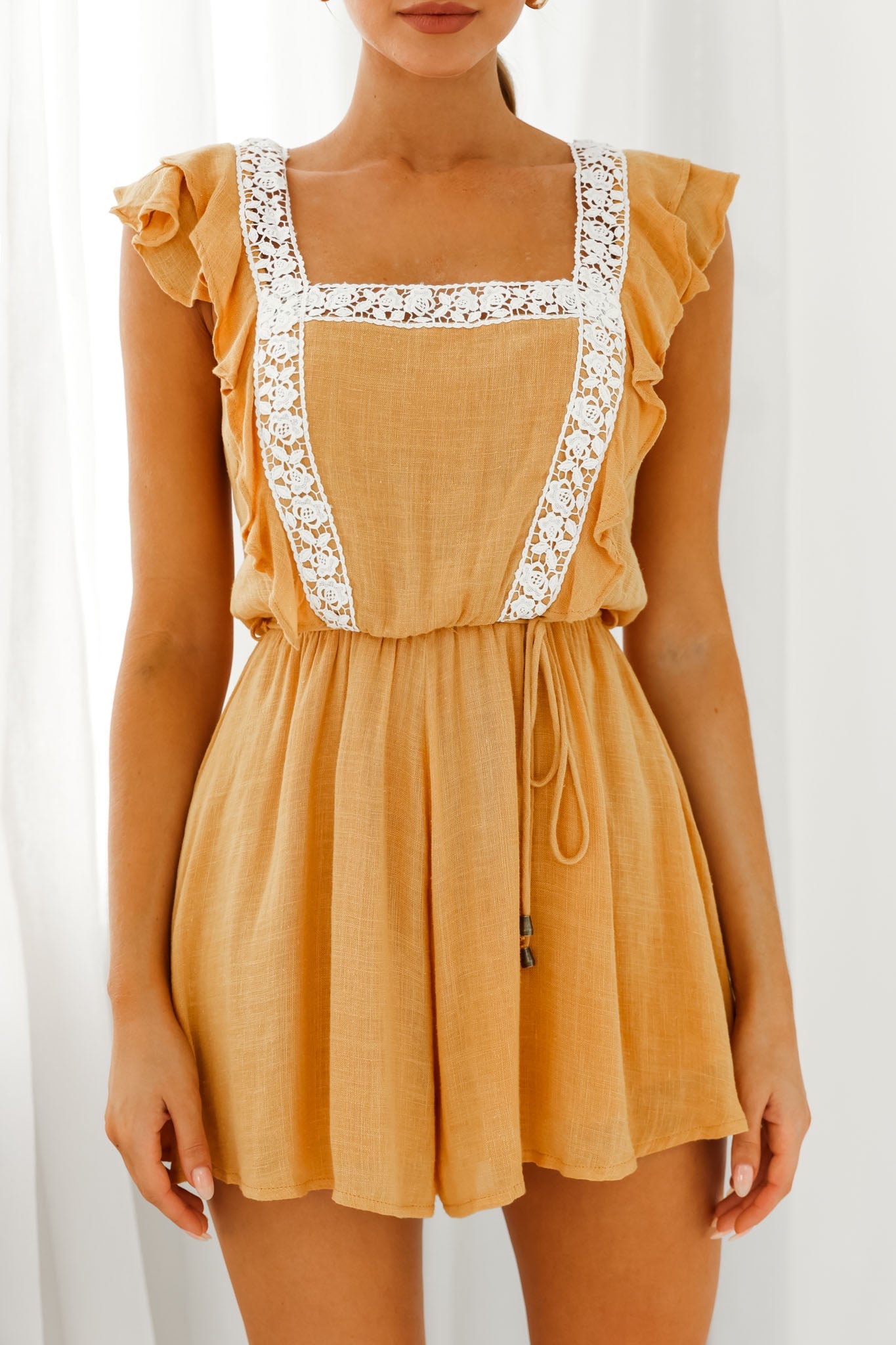 Meet Again Crochet Lace Trim Tie-Up Back Romper Mustard