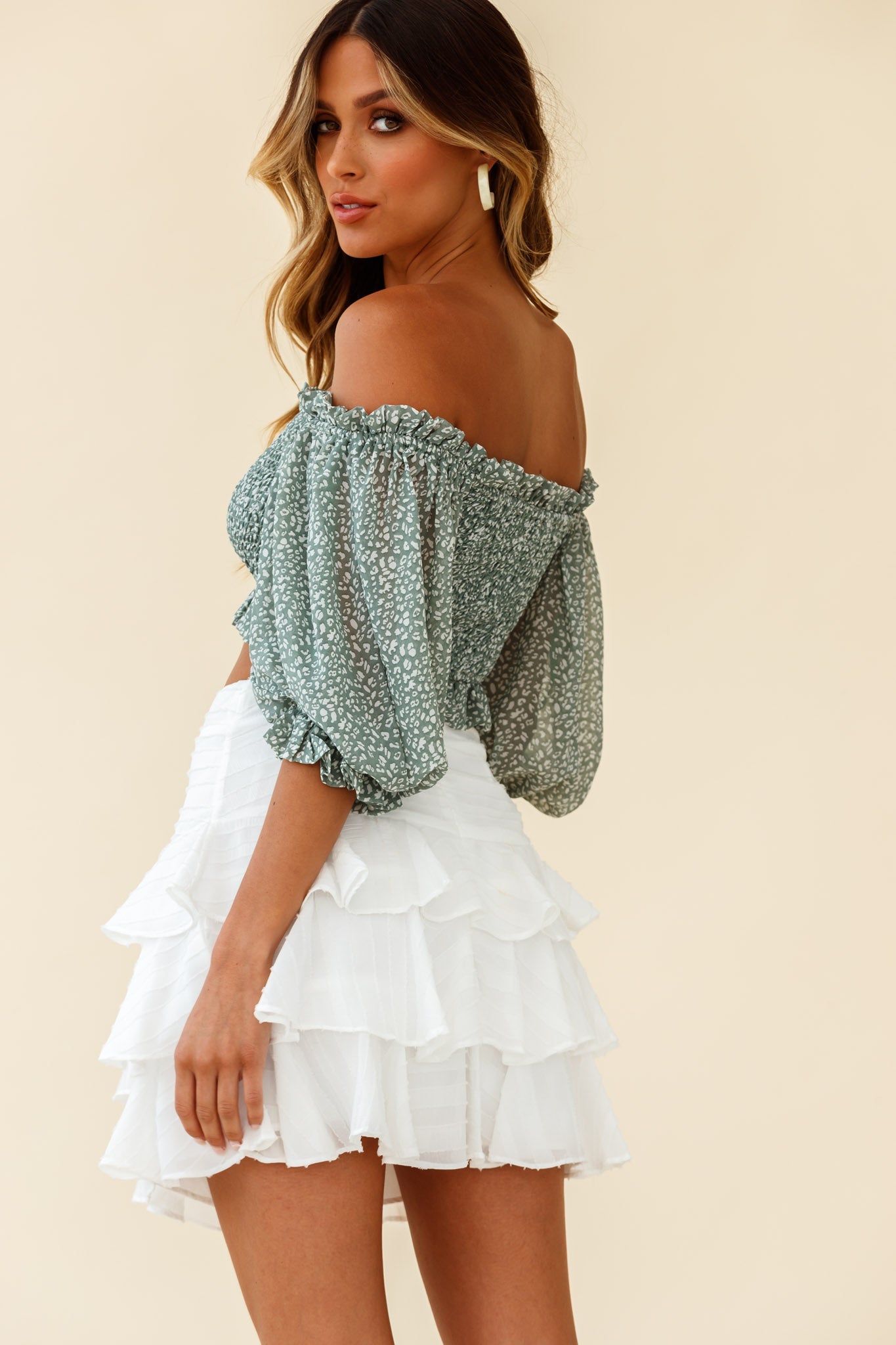 Meet Cute Shirred Bust Off-Shoulder Crop Top Speckle Print Olive