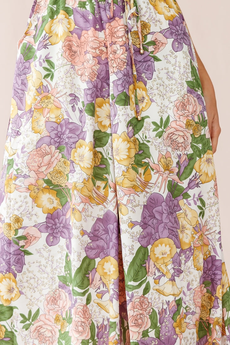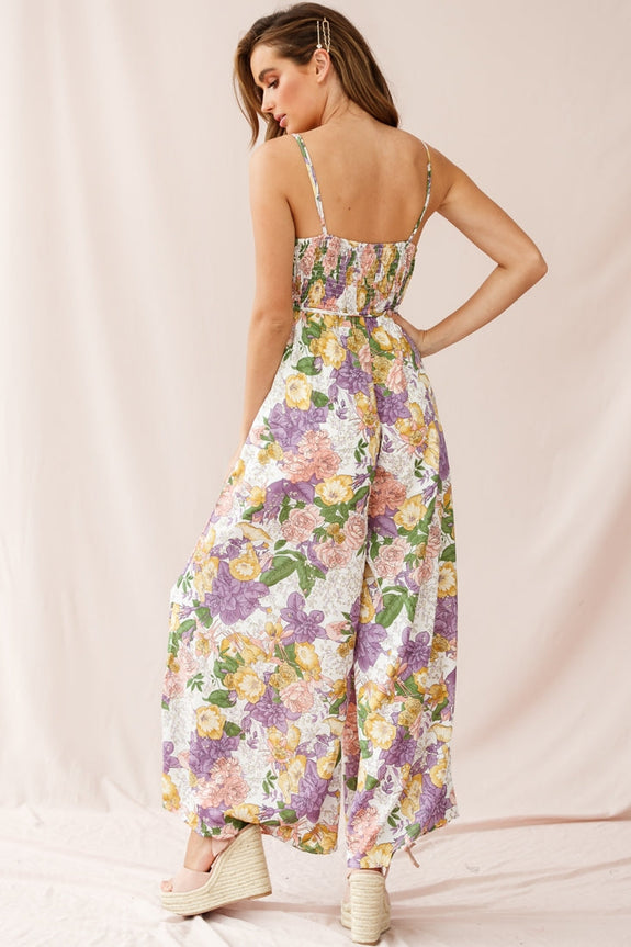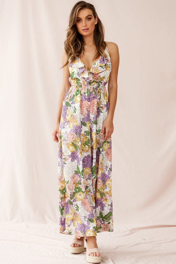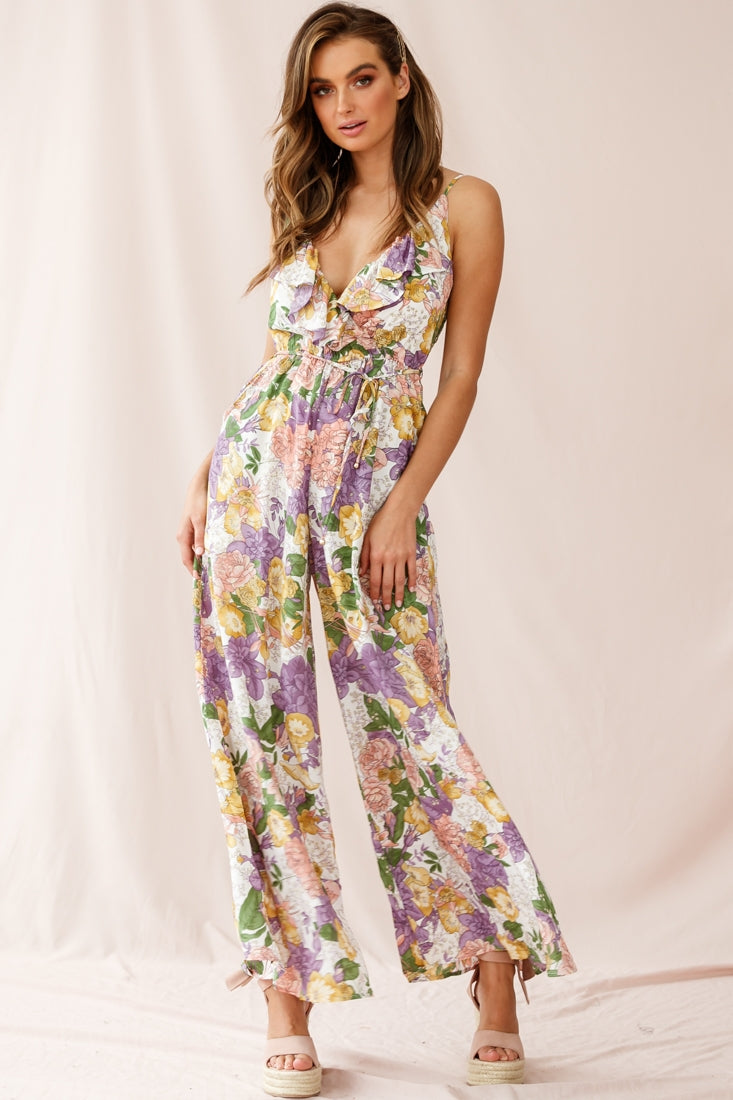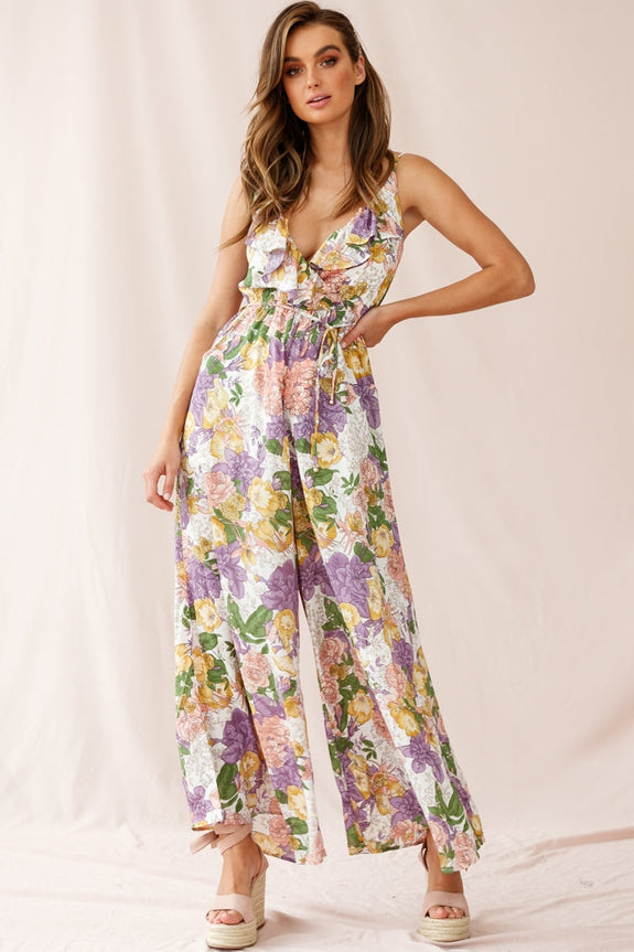 Melita Ruffle V-Neckline Jumpsuit Purple Print