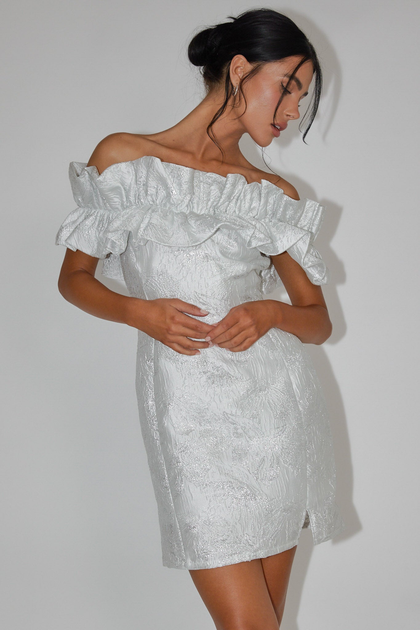 Steal the spotlight in our gorgeous Memoire mini dress. We are obsessed with its stunning jacquard fabric and showstopping off-shoulder frill. Perfect for homecoming or a special occasion! Team it with silver heels and a clutch for a look that will make jaws drop.