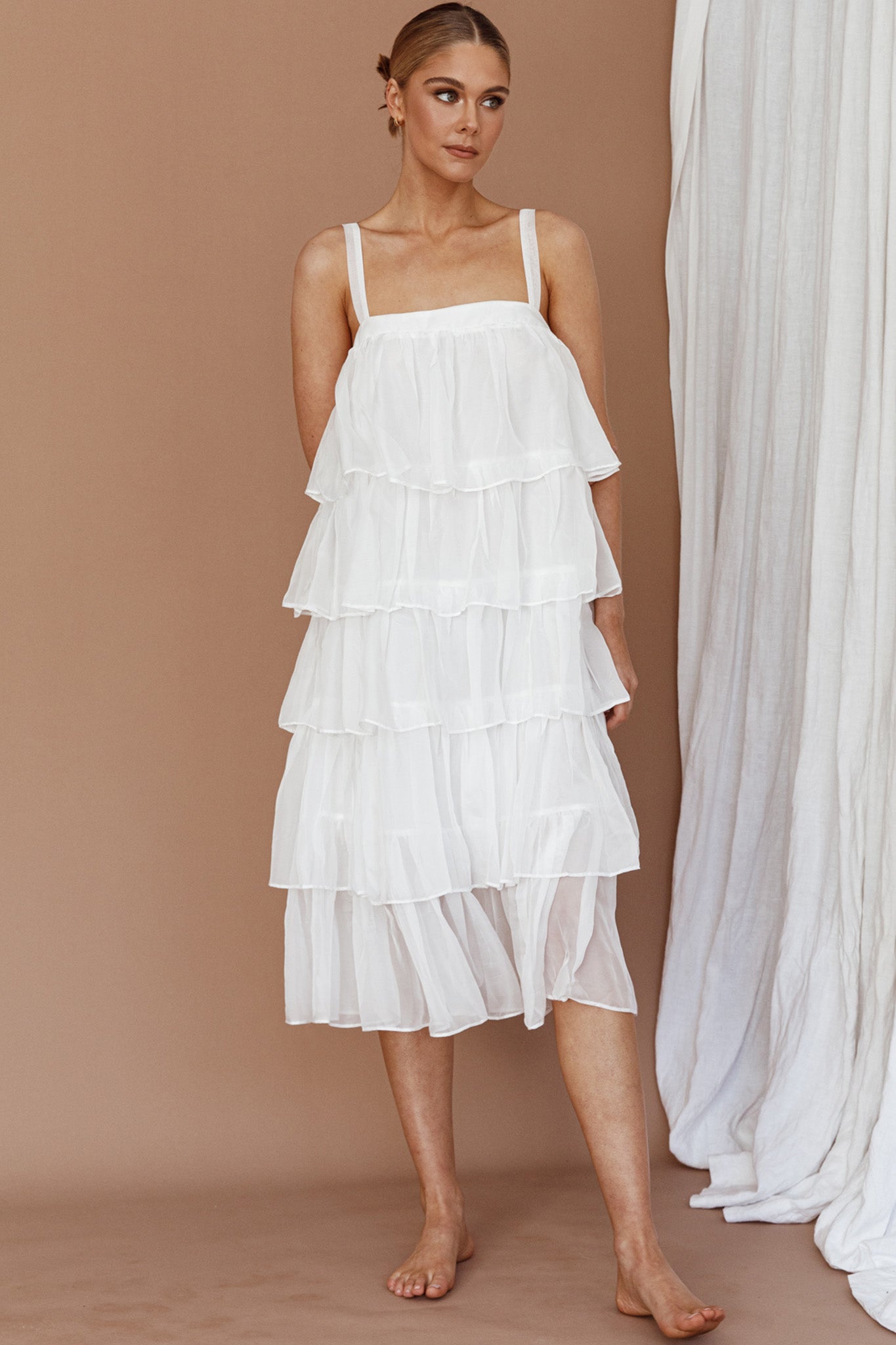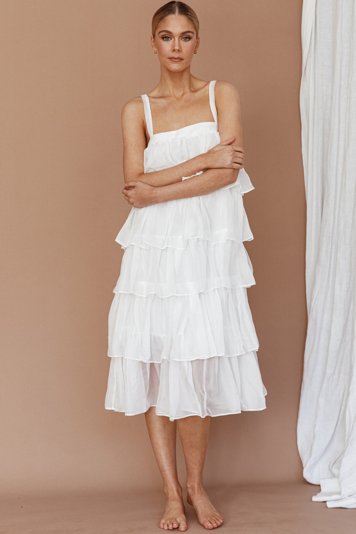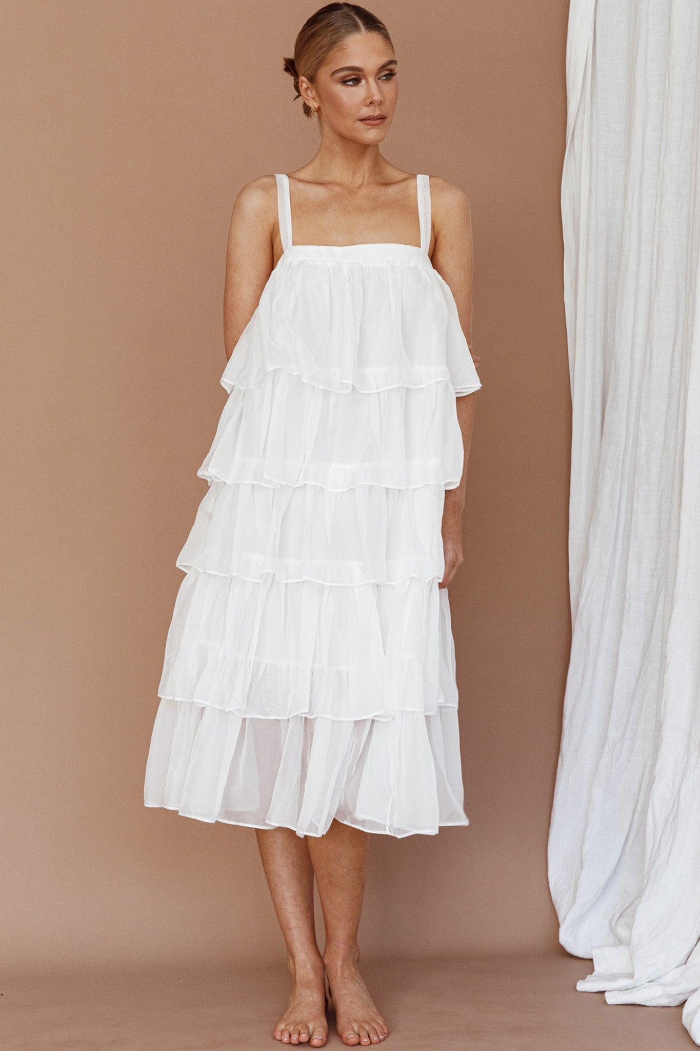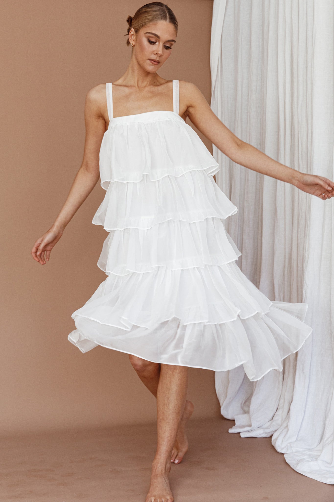 Make an entrance in our gorgeous Merry midi dress. Featuring adjustable straps and tiered, layered frills throughout. It's perfect for a bridal shower or a special occasion. Team it with perspex heels and a diamante clutch to complete the look.