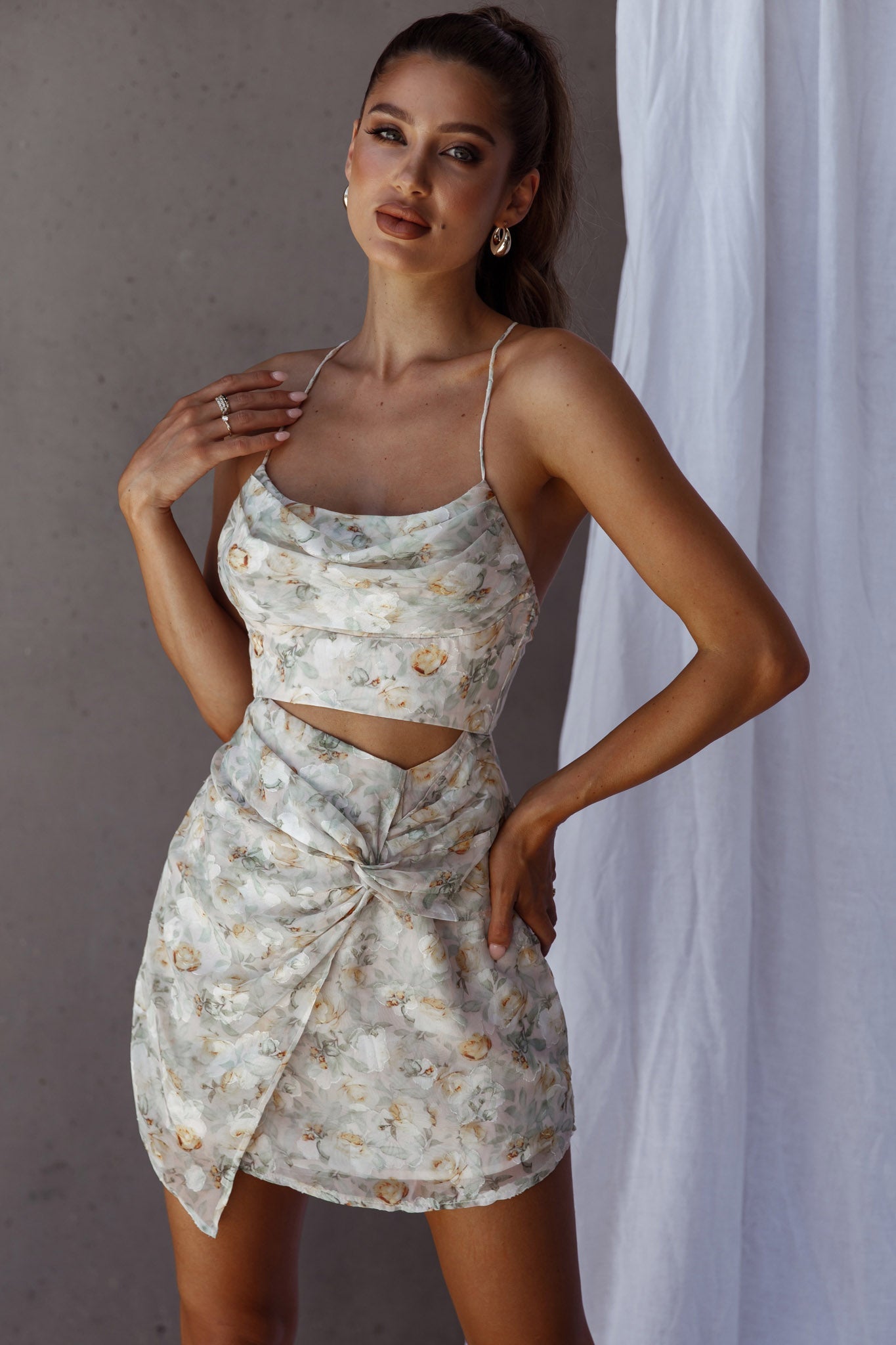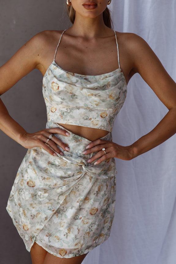 Miami Nights Cowl Neckline Twist Feature Mini Dress Floral Green