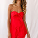Make a statement in our super cute Miki skort romper. Featuring a faux skirt look from the front, unique uneven hemline, strapless top and tie-knot bust. We are obsessed with the embroidered lace trim detail! This romper is perfect for day or night, casually paired with sandals or dressed up with a clear heel and delicate accessories. Hot!