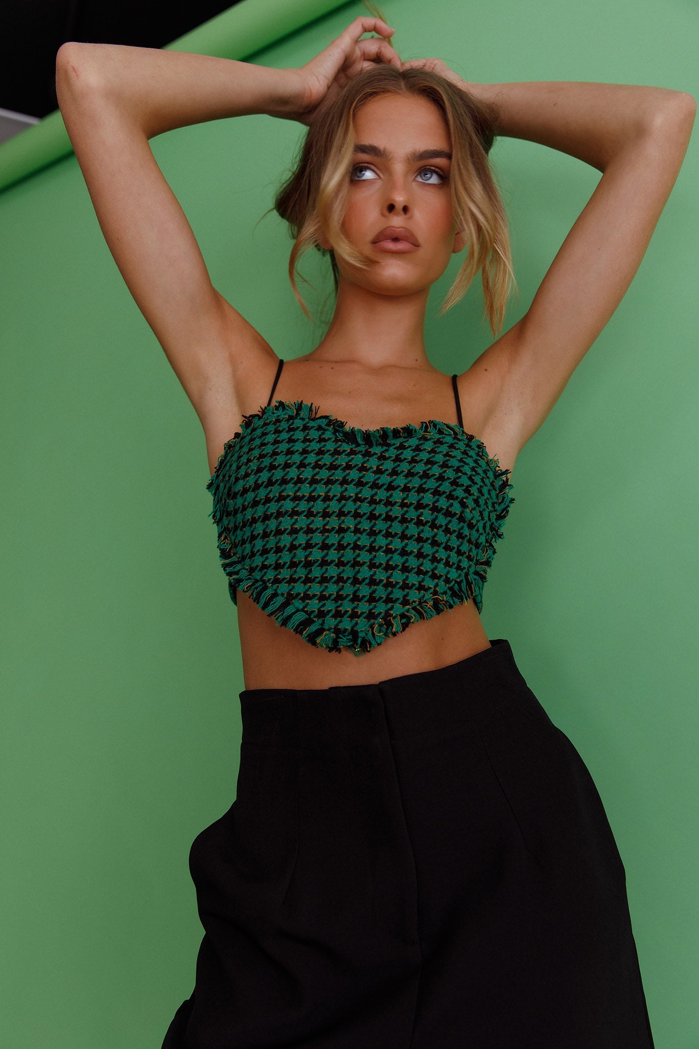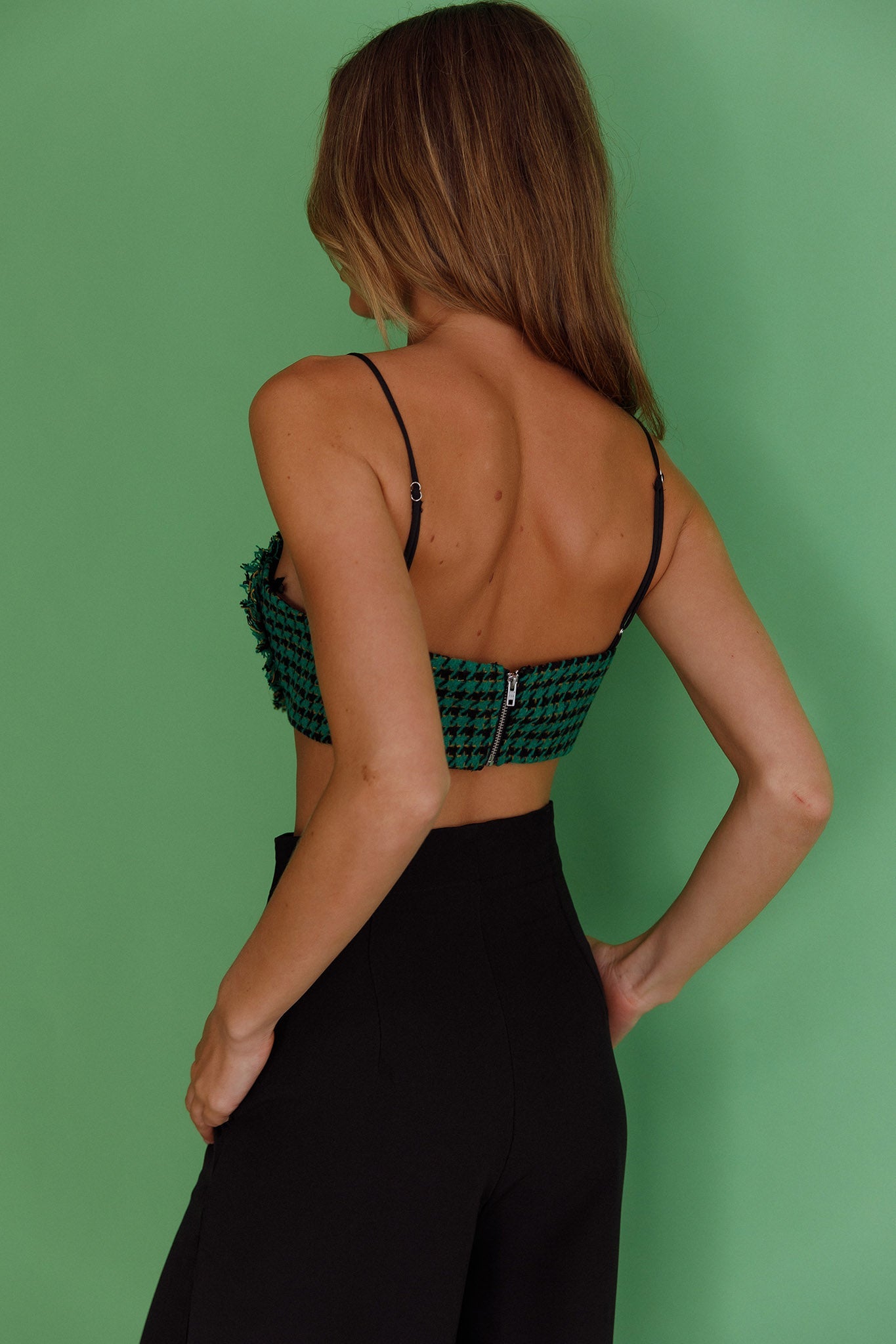 Channel your inner 90's queen with our Miss Fine crop top, giving us all the Fran Fine vibes! We are obsessed with its chic houndstooth fabric and heart-shaped bust. Perfect for a girls' night out teamed with high-waisted pants and mules.