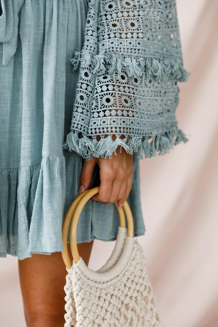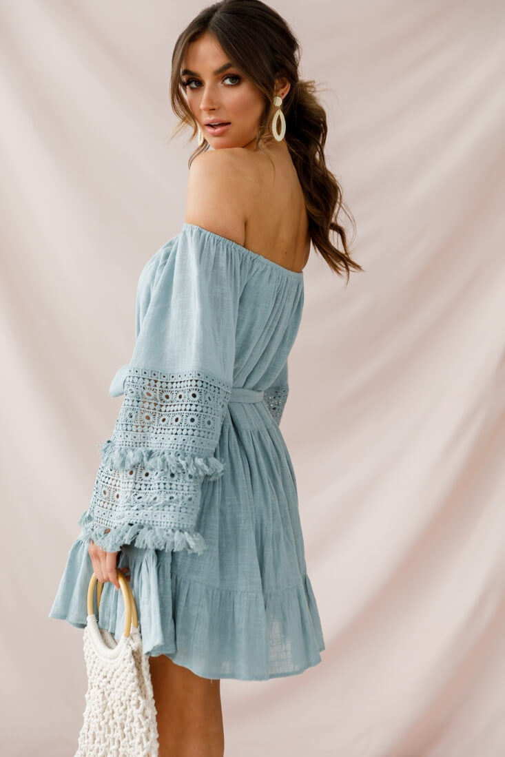 Channel your inner boho babe in this pretty off-shoulder dress. Featuring unique tassel detail and embroidery on the bell-style sleeves, a belted waist tie and ruffle-trimmed hem. Perfect for a day strolling the farmer's markets teamed with sneakers and a fedora or dress it up with canvas wedges and gold hoops earrings for a look we are loving.