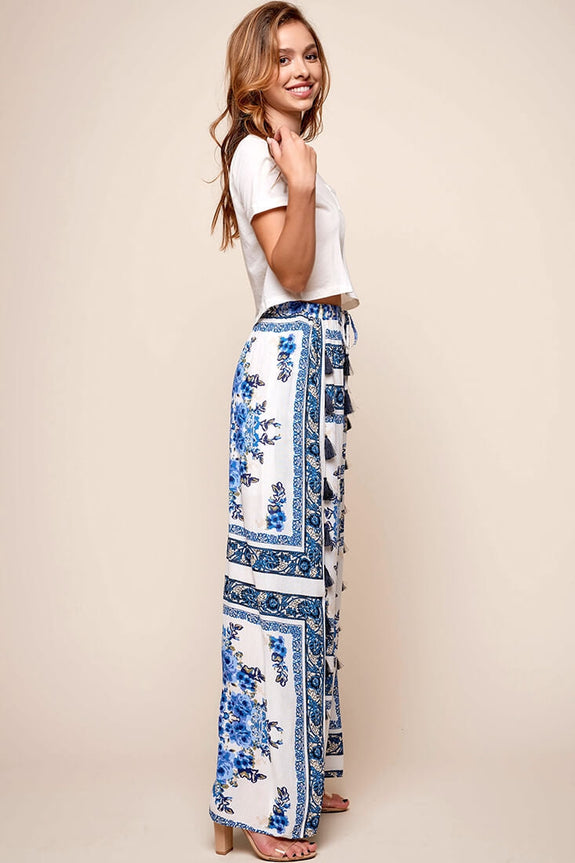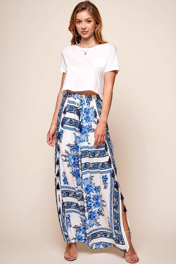 Feel like the princess of Monaco in these pretty, wide leg pants. Featuring the prettiest blue and white floral print, splits down the front and super cute tassel detailing down each leg, these pants tie at the front with a drawstring and are ultra comfortable. So chic paired with a fresh white crop top and canvas espadrille wedges.