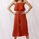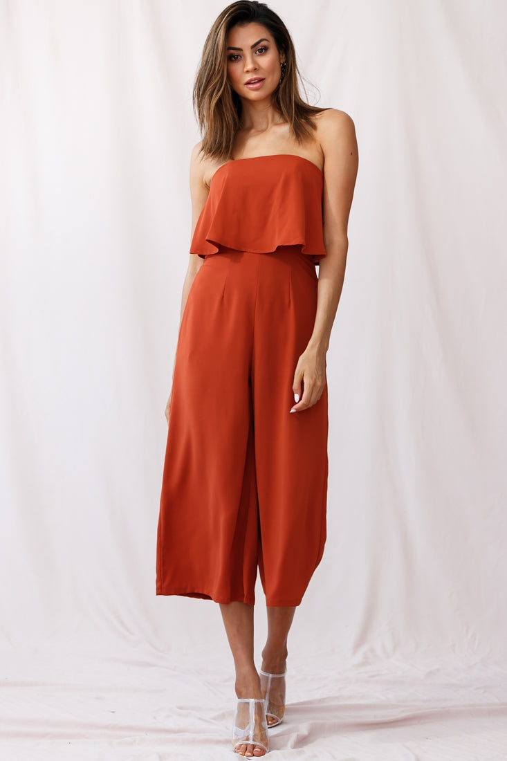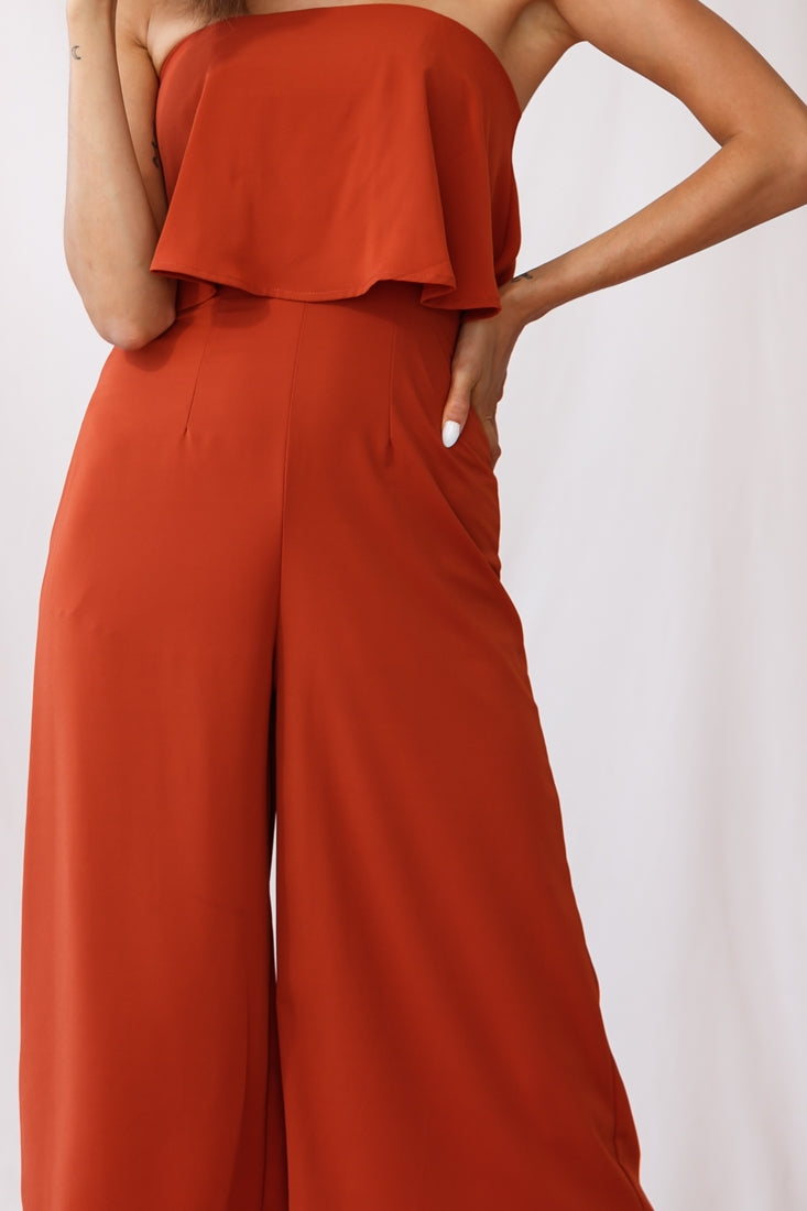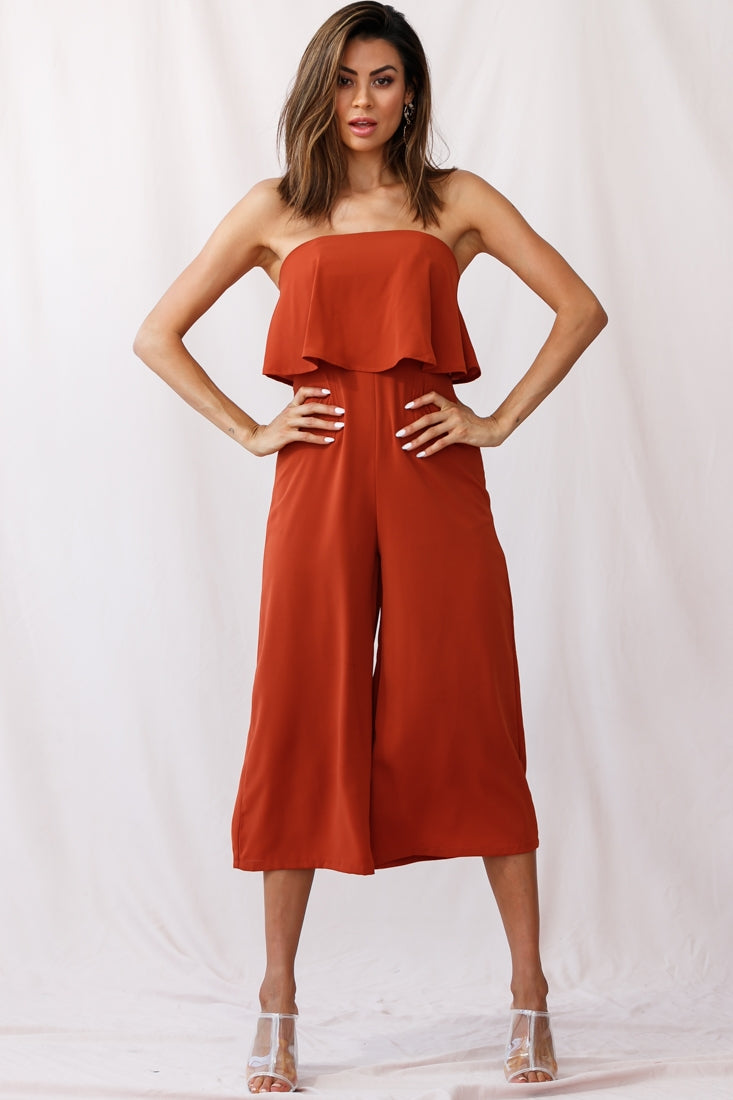 We are loving this chic and versatile jumpsuit. Wear it to the office or out for cocktails with the girls. Featuring a strapless bust and floaty frill overlay and fastening at the back with a zipper. This is a wardrobe staple as it can pull double duty on those days you don't have time to go home and change after work. Simply through on a statement necklace or earrings and a red lip and hello girl, you've just gone from office chic to cocktail hour on fleek.
