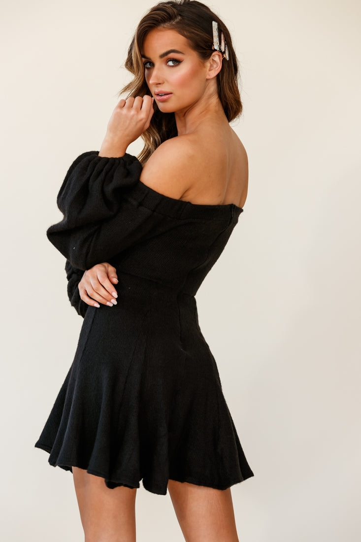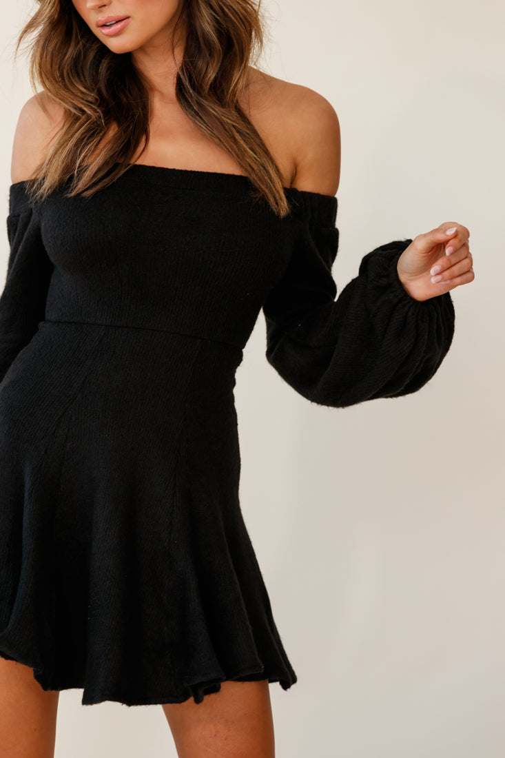 Perfect for those snowed-in days. Off the shoulder and fit and flare style keep this wool-look modern. Cuddle up in this dress with a good book and a messy top knot.
