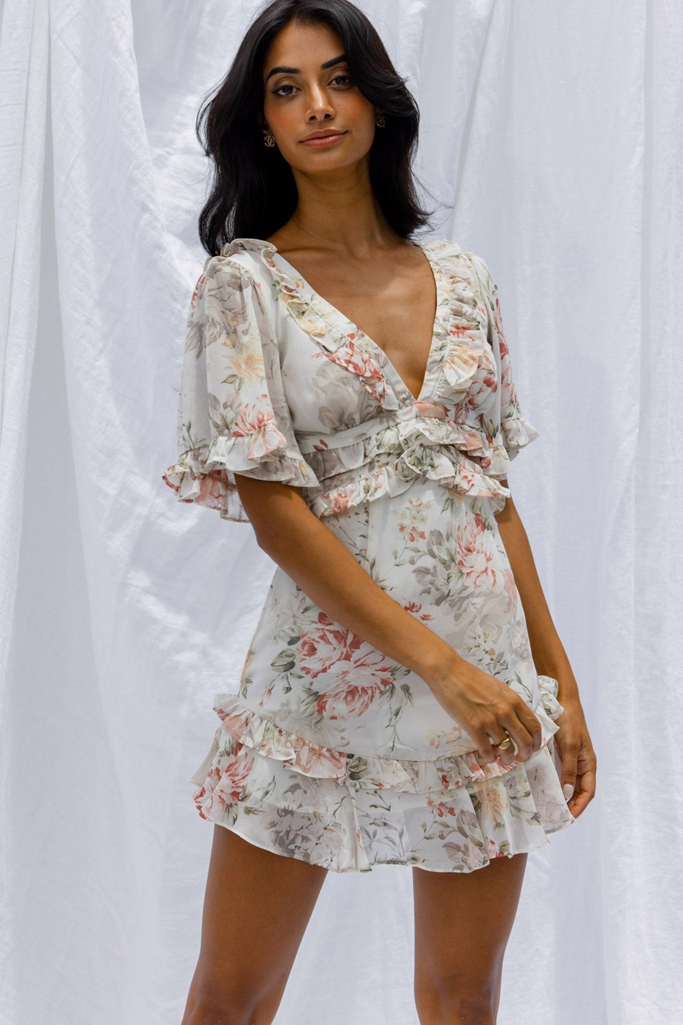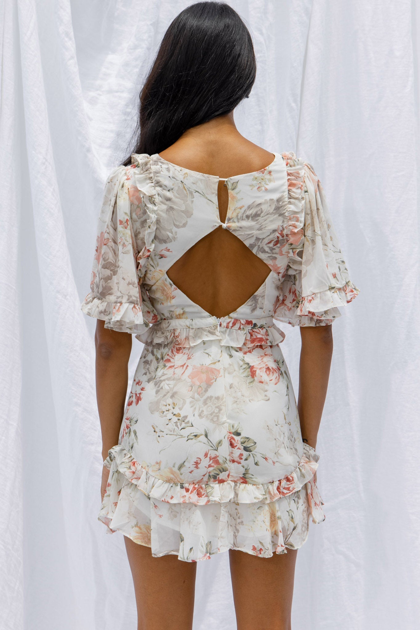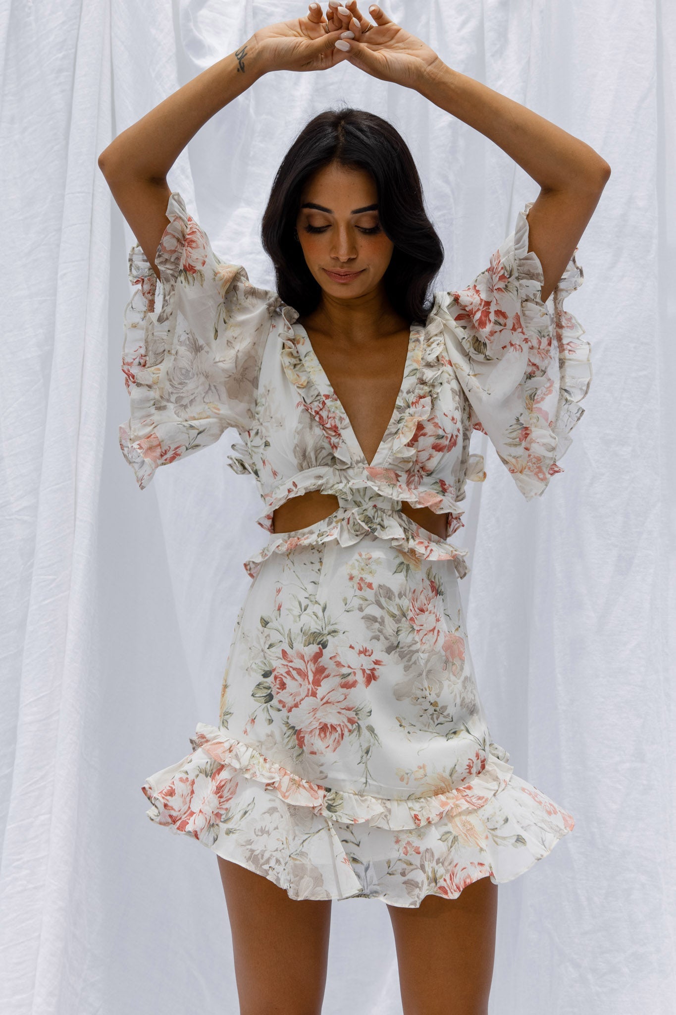 My Belle Cut-Out Detail Frill Accent Dress Vintage Floral Print White
