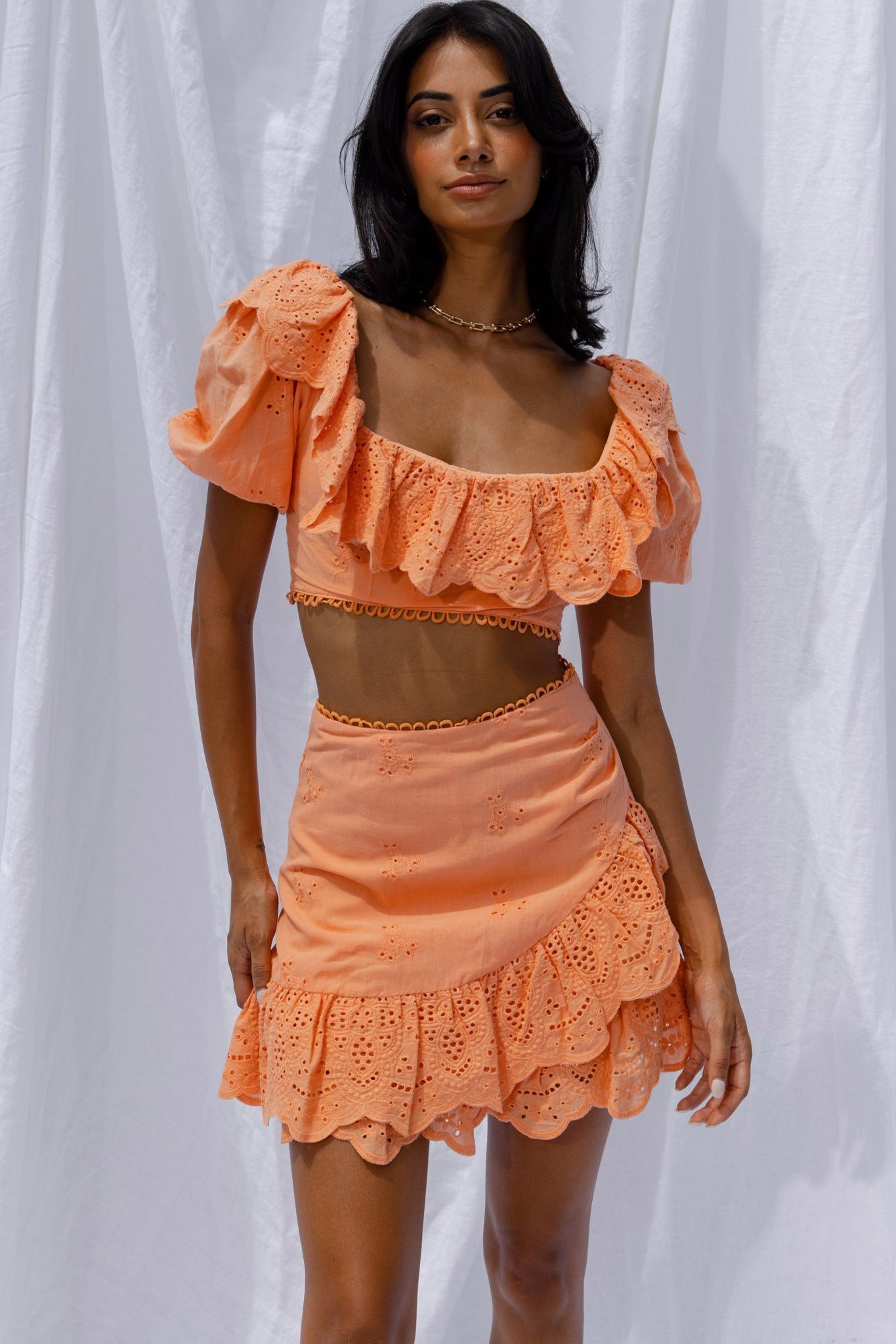 You're a real cutie in our New Moon skirt. We are loving its scalloped, ruffle trim and eyelet embroidery throughout. Perfect for a first date or lunches with your girls. Team it with its matching crop top and nude mules for a look that'll steal the show.
