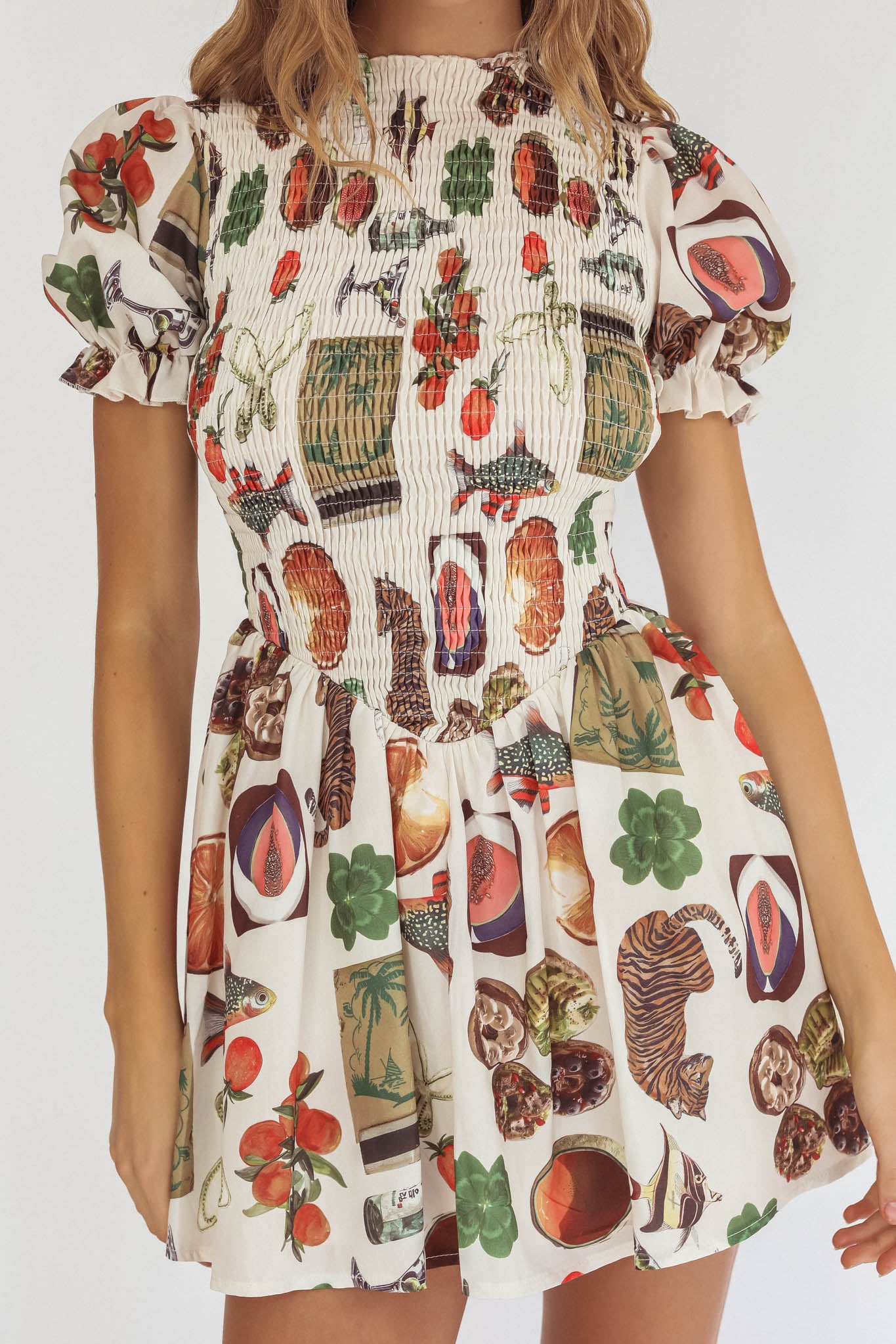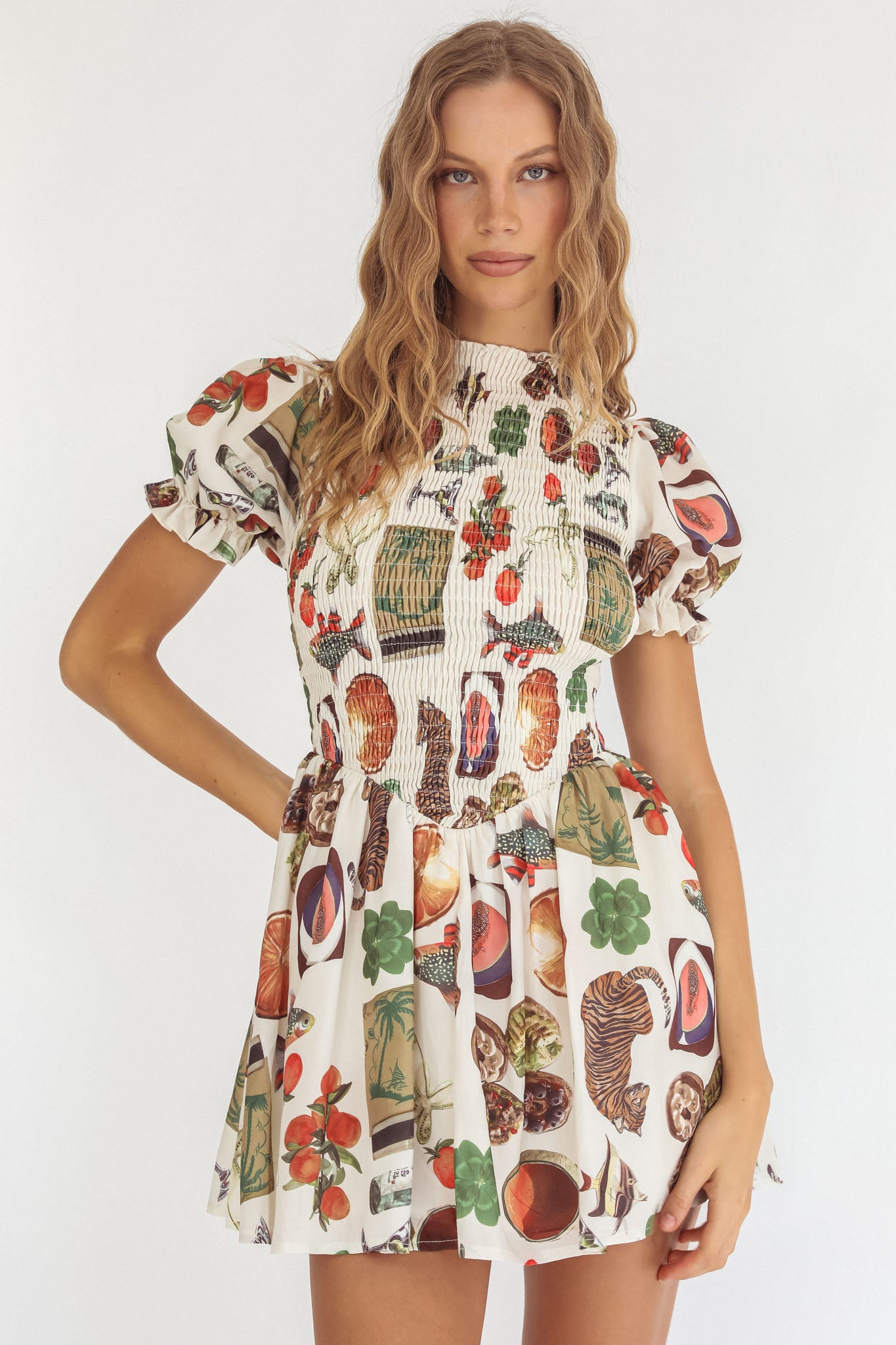 Nia Shirred Puff Sleeve Mini Dress Exotic Print Beige