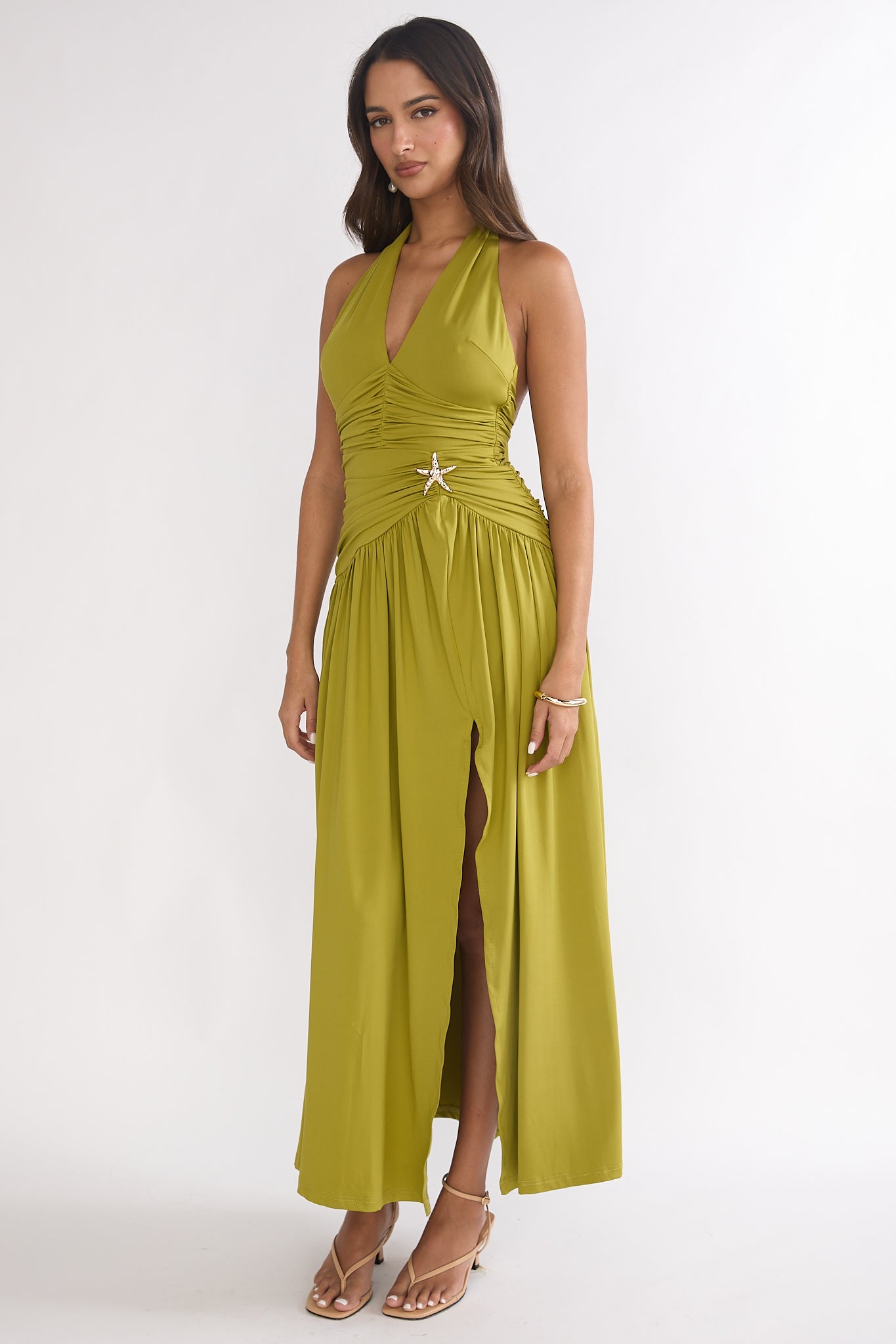 Nightbloom Ruched Waist Halter Maxi Dress Olive