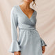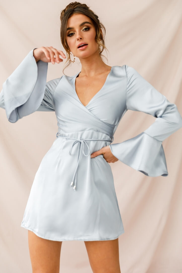 Get everyone's attention in this silky number. Those flared cuffs are giving us a sexy 70's vibe and we don't mind. Featuring a crossover V-neckline and spaghetti-thin string tie around the waist, you'll feel like hitting the disco and dancing 'til dawn. Team it with some metallic platform heels and hoop earrings, groovy baby!