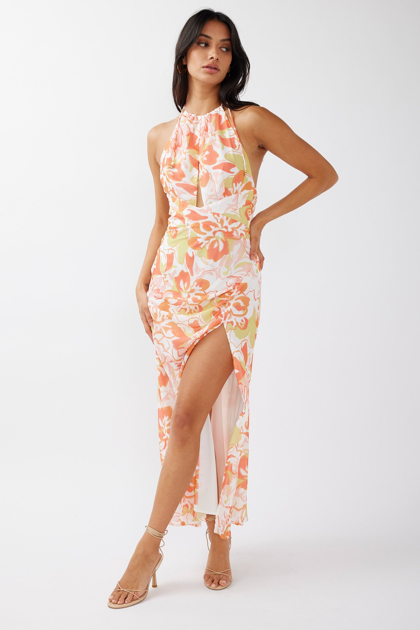 Nirvana Halterneck Split Midi Dress Floral Orange