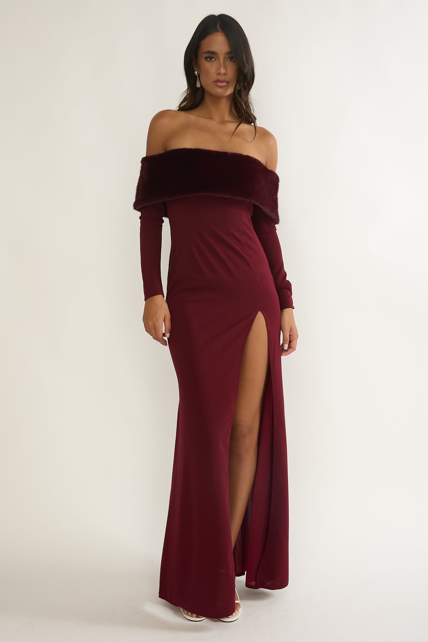 Noella Off-Shoulder Fur Trim Maxi Dress Wine