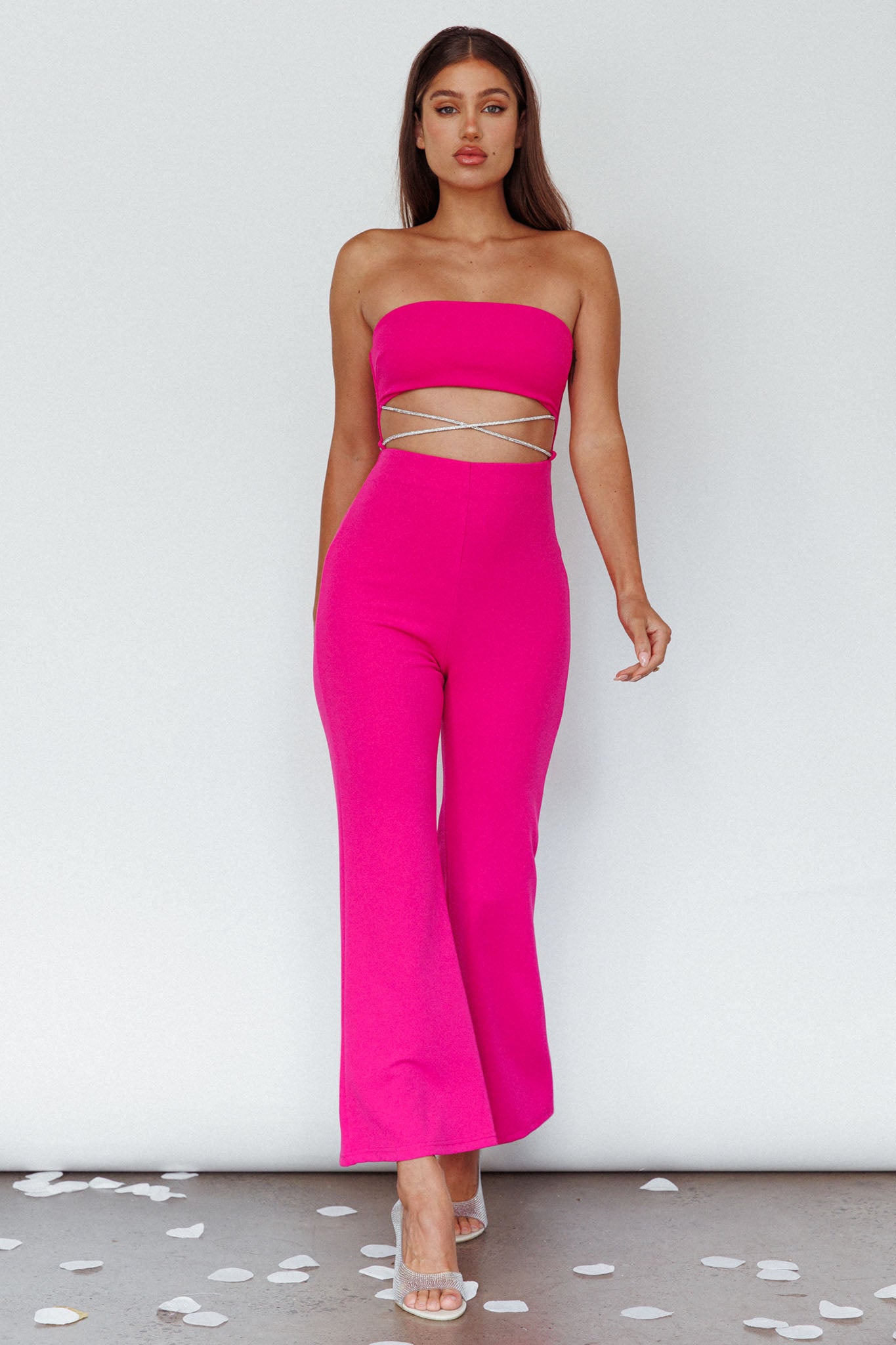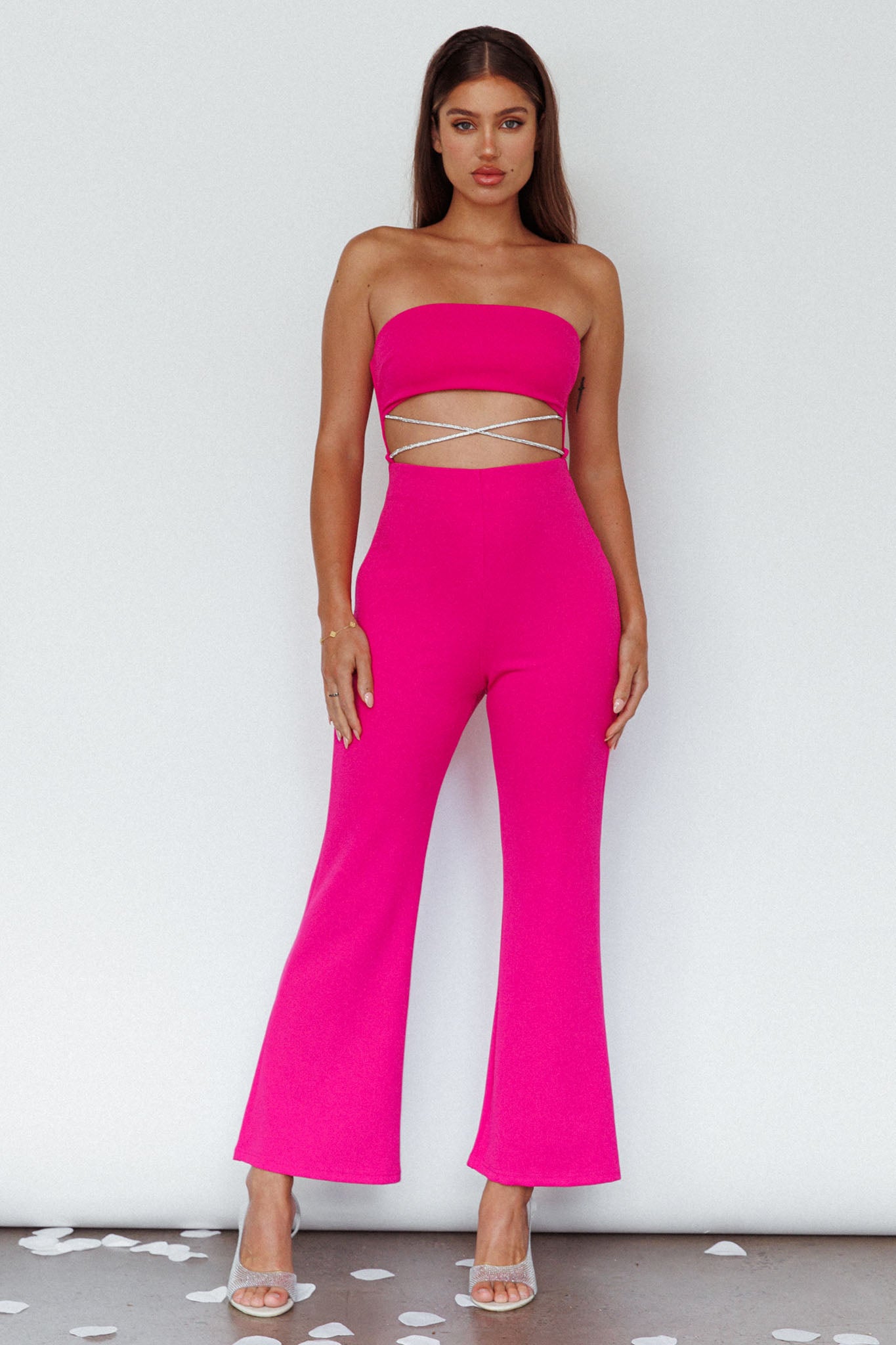 Make an entrance in our hot Nohemi jumpsuit. Featuring a cut-out waist with diamante strap detail that ties in the back, we're obsessed! Perfect for a girls' night out or birthday celebration teamed with a clutch and diamante mules!
