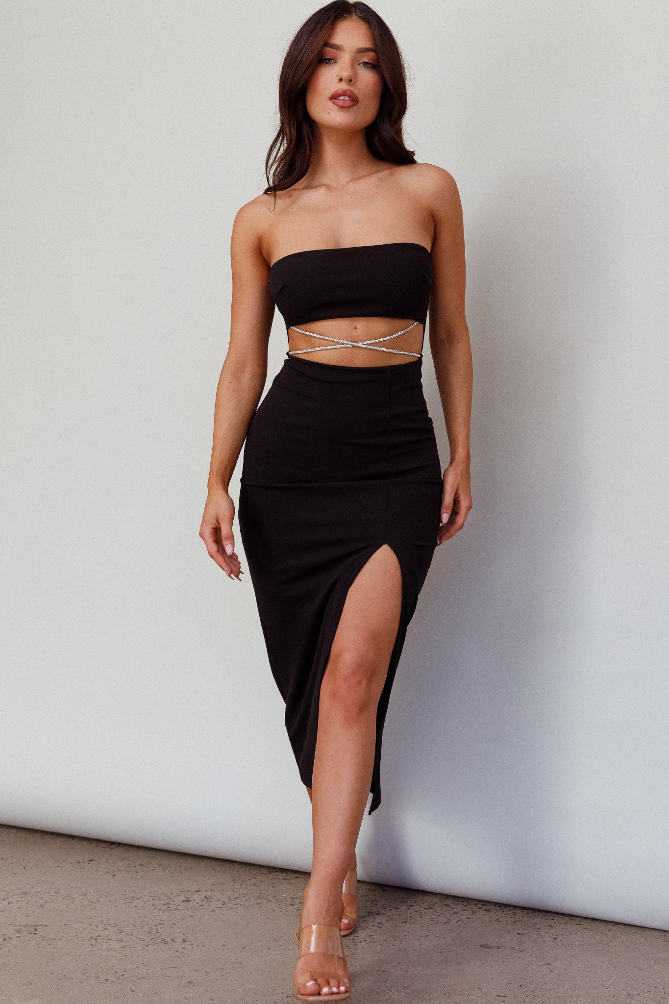 Make an entrance in our hot Nohemi midi dress. Featuring a cut-out waist with diamante strap detail that ties in the back, we're obsessed! Perfect for a girls' night out or birthday celebration teamed with a clutch and diamante mules!