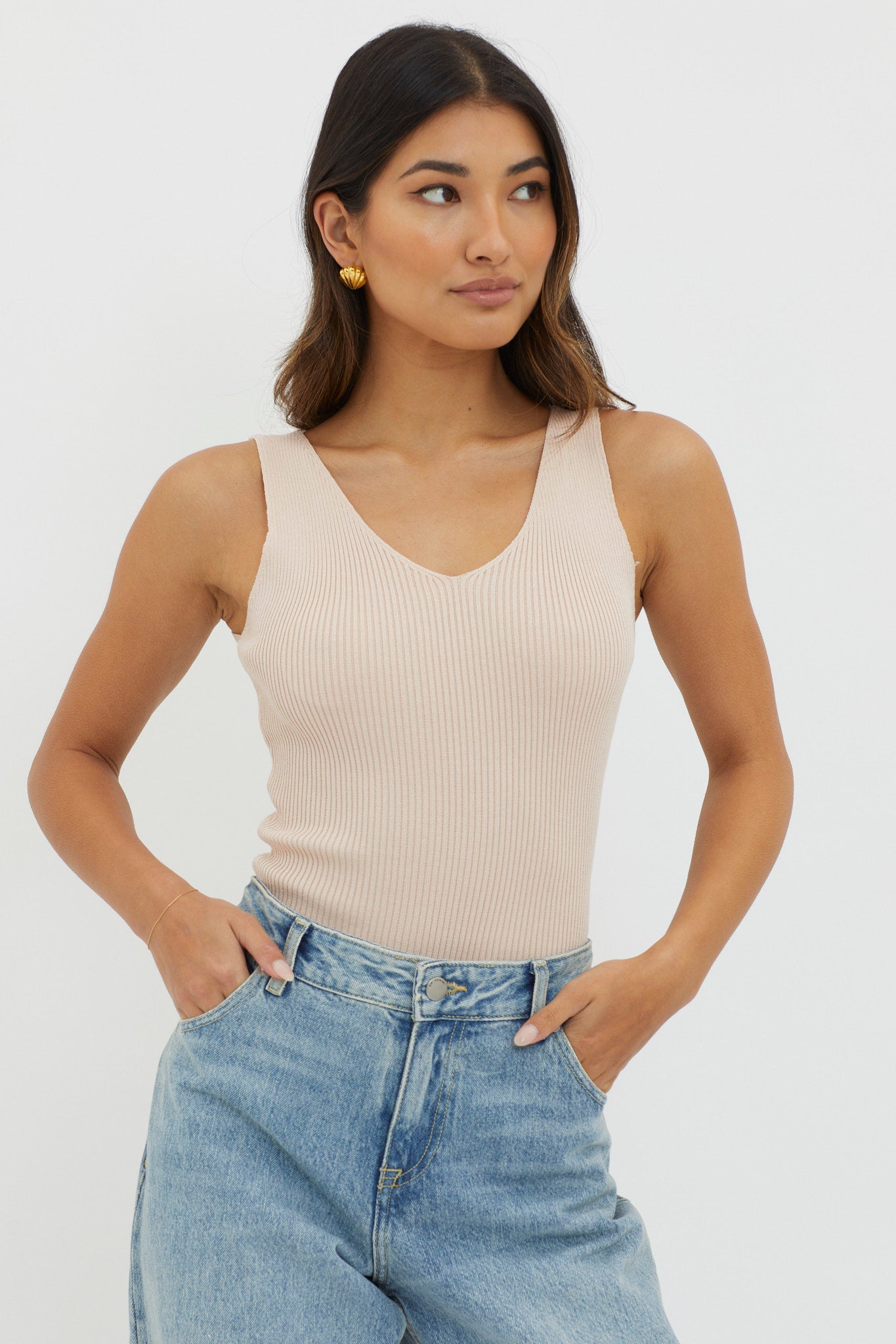 Off-Duty V-Neck Ribbed Knit Top Beige
