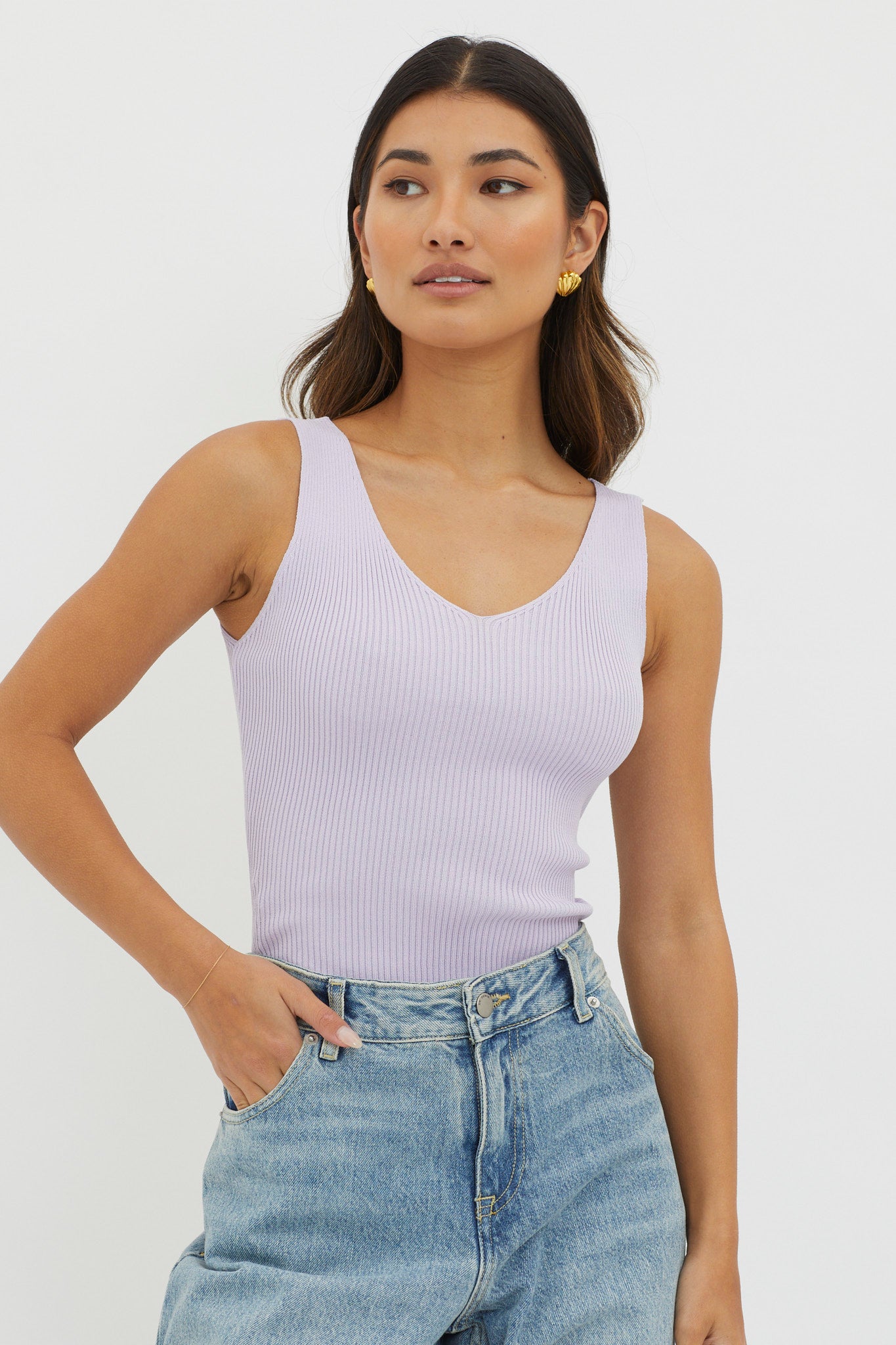Off-Duty V-Neck Ribbed Knit Top Lilac