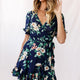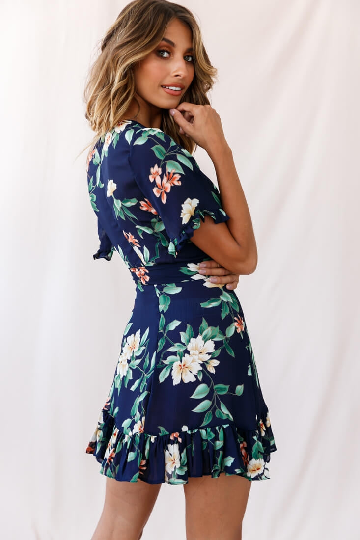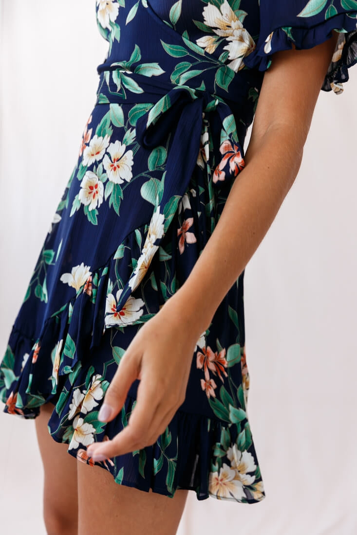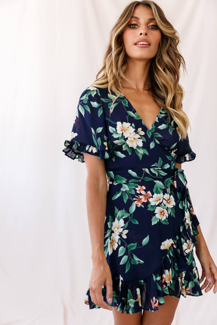 Omara Floral Wrap Ruffle Trim Dress Navy