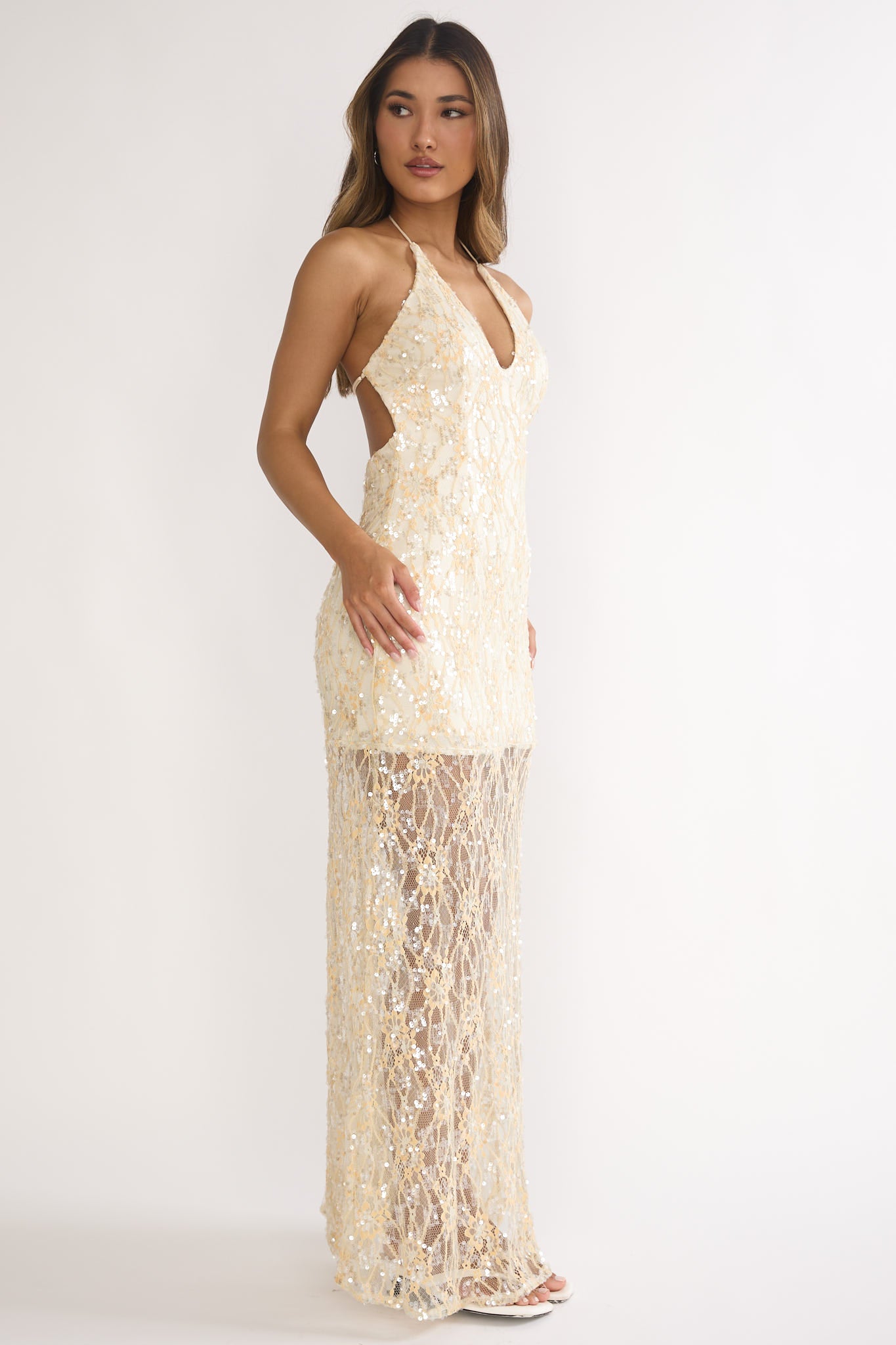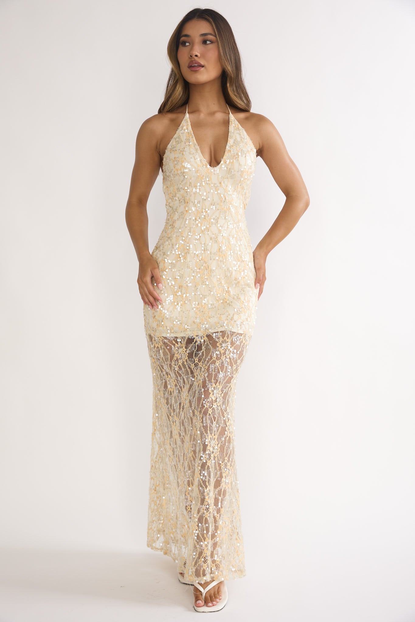 You will stop the show in our pretty One Night maxi dress. It features a halter design and sequin embellishment detail throughout. It's perfect for a glam birthday dinner with your girls teamed with nude heels and a clutch.